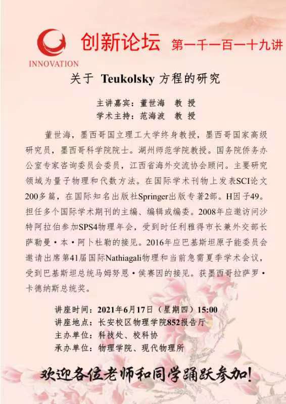 董世海 教 授 8868体育登录创新论坛第一千一百一十九讲:关于 Teukolsky 方程的研究 讲座时间 2021年6月17日(星期四)15:00 讲座地点 长安校区物理学院852报告厅 讲座人介绍 董世海 教 授 讲座内容