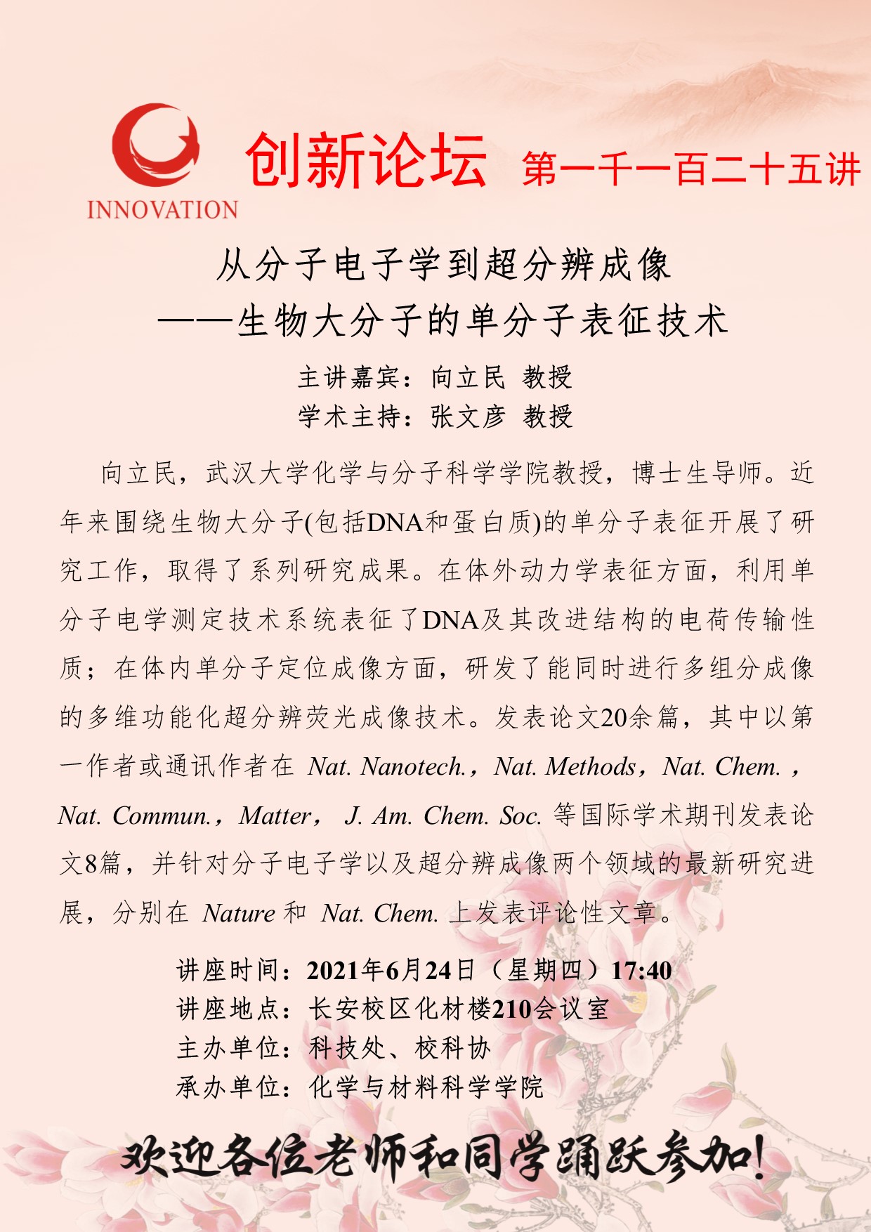 向立民 教授 8868体育登录创新论坛第一千一百二十五讲:从分子电子学到超分辨成像——生物大分子的单分子表征技术 讲座时间 2021年6月24日(星期四)17:40 讲座地点 长安校区化材楼210会议室 讲座人介绍 向立民 教授 讲座内容