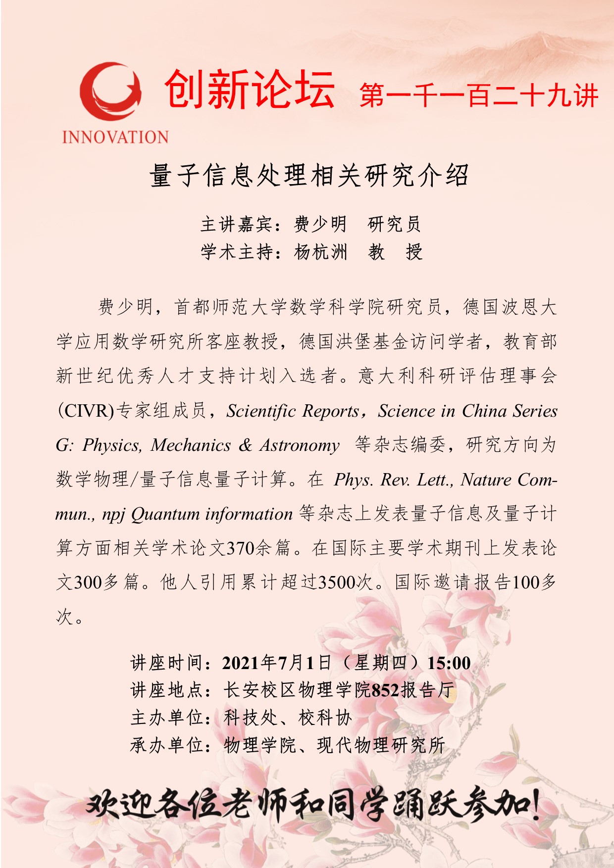 费少明 研究员 8868体育登录创新论坛第一千一百二十九讲:量子信息处理相关研究介绍 讲座时间 2021年7月1日(星期四)15:00 讲座地点 长安校区物理学院852报告厅 讲座人介绍 费少明 研究员 讲座内容