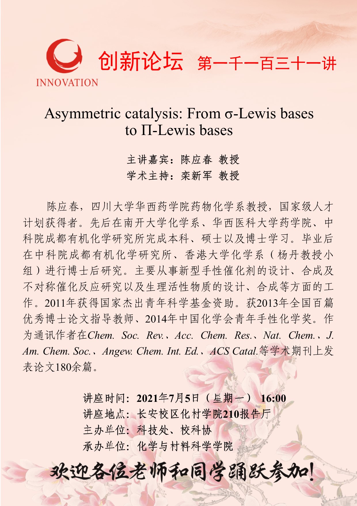陈应春 教授 8868体育登录创新论坛第一千一百三十一讲:Asymmetric catalysis: From σ-Lewis bases to Π-Lewis bases 讲座时间 2021年7月5日(星期一)16:00 讲座地点 长安校区化材学院210报告厅 讲座人介绍 陈应春 教授 讲座内容
