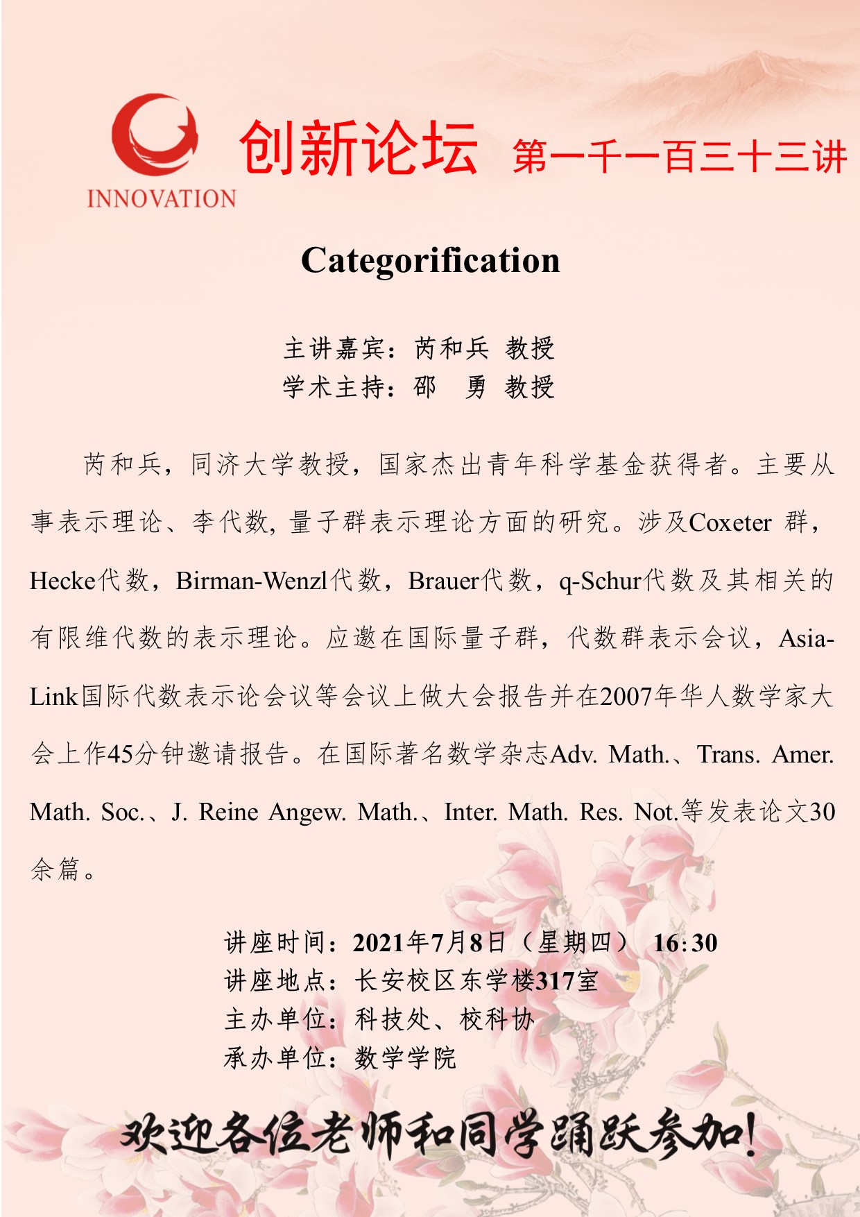 芮和兵 教授 8868体育登录创新论坛第一千一百三十三讲:Categorification 讲座时间 2021年7月8日(星期四)16:30 讲座地点 长安校区东学楼317室 讲座人介绍 芮和兵 教授 讲座内容