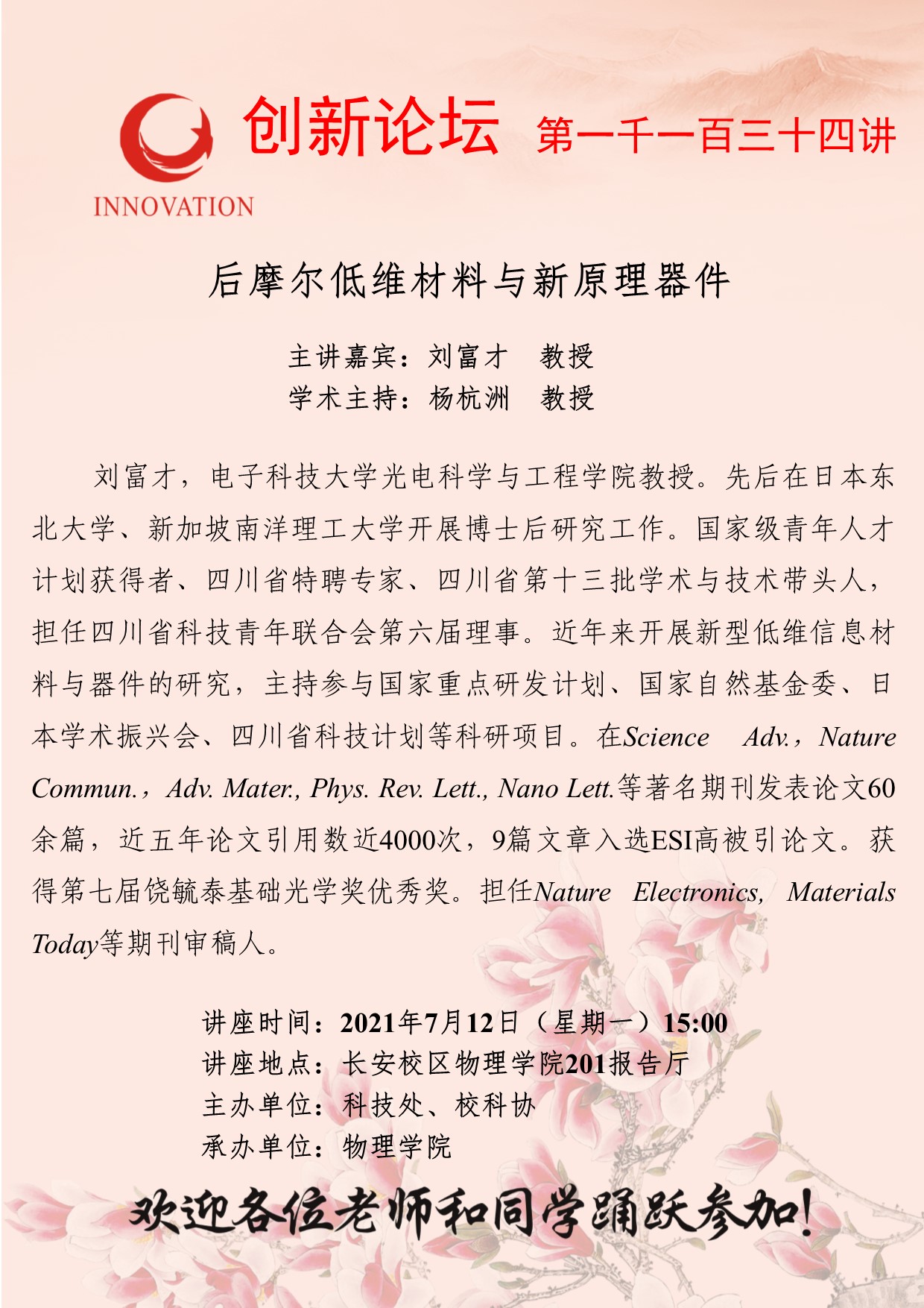 刘富才 教授 8868体育登录创新论坛第一千一百三十四讲:后摩尔低维材料与新原理器件 讲座时间 2021年7月12日(星期一)15:00 讲座地点 长安校区物理学院201报告厅 讲座人介绍 刘富才 教授 讲座内容
