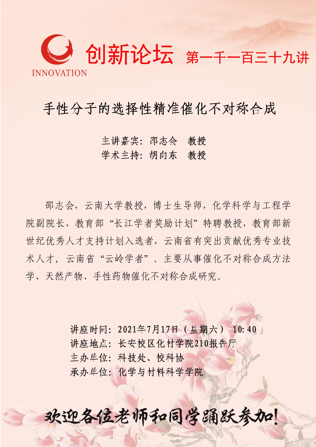 邵志会 教授 8868体育登录创新论坛第一千一百三十九讲:手性分子的选择性精准催化不对称合成 讲座时间 2021年7月17日(星期六) 10:40 讲座地点 长安校区化材学院210报告厅 讲座人介绍 邵志会 教授 讲座内容