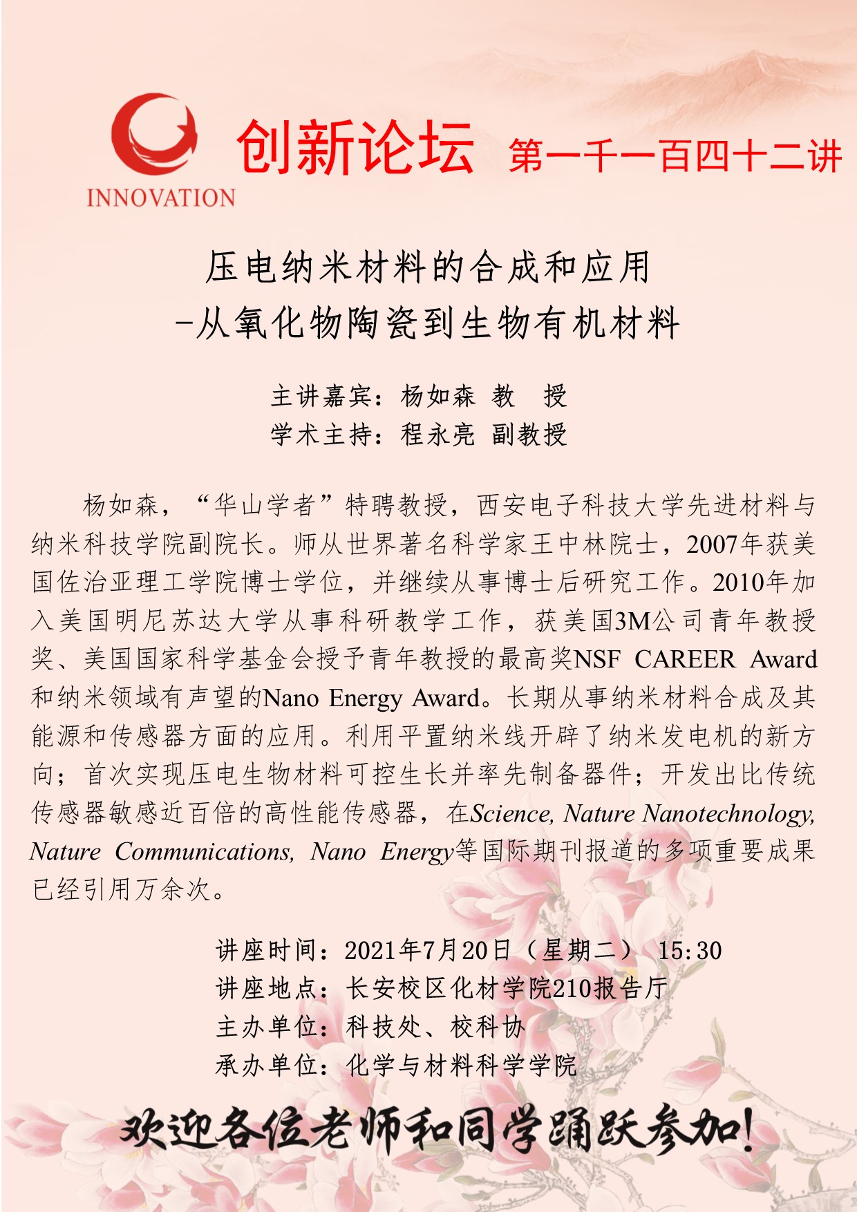 杨如森 教授 8868体育登录创新论坛第一千一百四十二讲:压电纳米材料的合成和应用-从氧化物陶瓷到生物有机材料 讲座时间 2021年7月20日(星期二) 15:30 讲座地点 长安校区化材学院210报告厅 讲座人介绍 杨如森 教授 讲座内容
