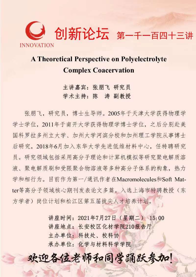 张朋飞 研究员 8868体育登录创新论坛第一千一百四十三讲:A Theoretical Perspective on Polyelectrolyte Complex Coacervation 讲座时间 2021年7月27日(星期二) 15:00 讲座地点 长安校区化材学院210报告厅 讲座人介绍 张朋飞 研究员 讲座内容