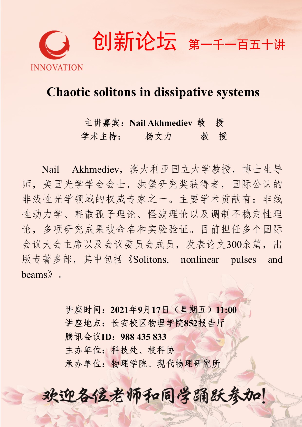 Nail Akhmediev 教授 8868体育登录创新论坛第一千一百五十讲:Chaotic solitons in dissipative systems 讲座时间 2021年9月17日(星期五)11:00 讲座地点 长安校区物理学院852报告厅 讲座人介绍 Nail Akhmediev 教授 讲座内容