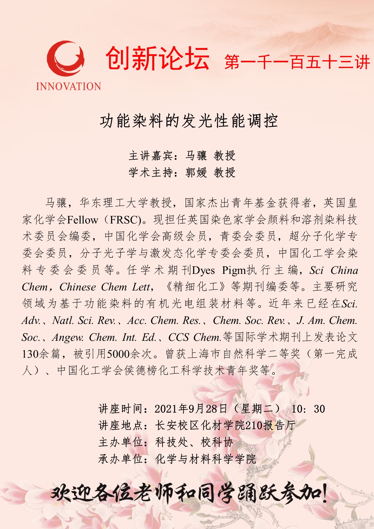 马骧 教授 8868体育登录创新论坛第一千一百五十三讲:功能染料的发光性能调控 讲座时间 2021年9月28日(星期二) 10: 30 讲座地点 长安校区化材院学院210报告厅 讲座人介绍 马骧 教授 讲座内容
