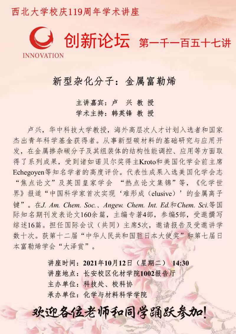 卢兴 教授 8868体育登录创新论坛第一千一百五十七讲暨校庆119周年学术讲座: 新型杂化分子:金属富勒烯 讲座时间 2021年10月12日(星期二)14:30 讲座地点 长安校区化材学院1002报告厅 讲座人介绍 卢兴 教授 讲座内容