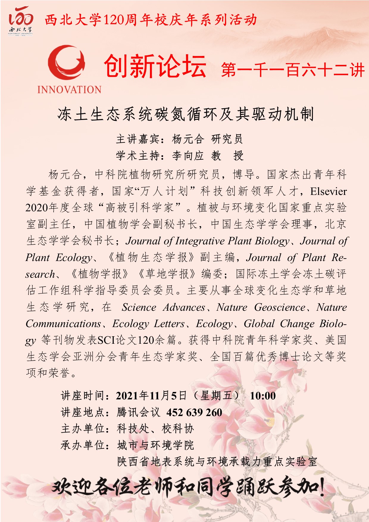 杨元合 研究员 8868体育登录创新论坛第一千一百六十二讲暨120周年校庆年系列活动:冻土生态系统碳氮循环及其驱动机制 讲座时间 2021年11月5日(星期五)10:00 讲座地点 腾讯会议 452 639 260 讲座人介绍 杨元合 研究员 讲座内容