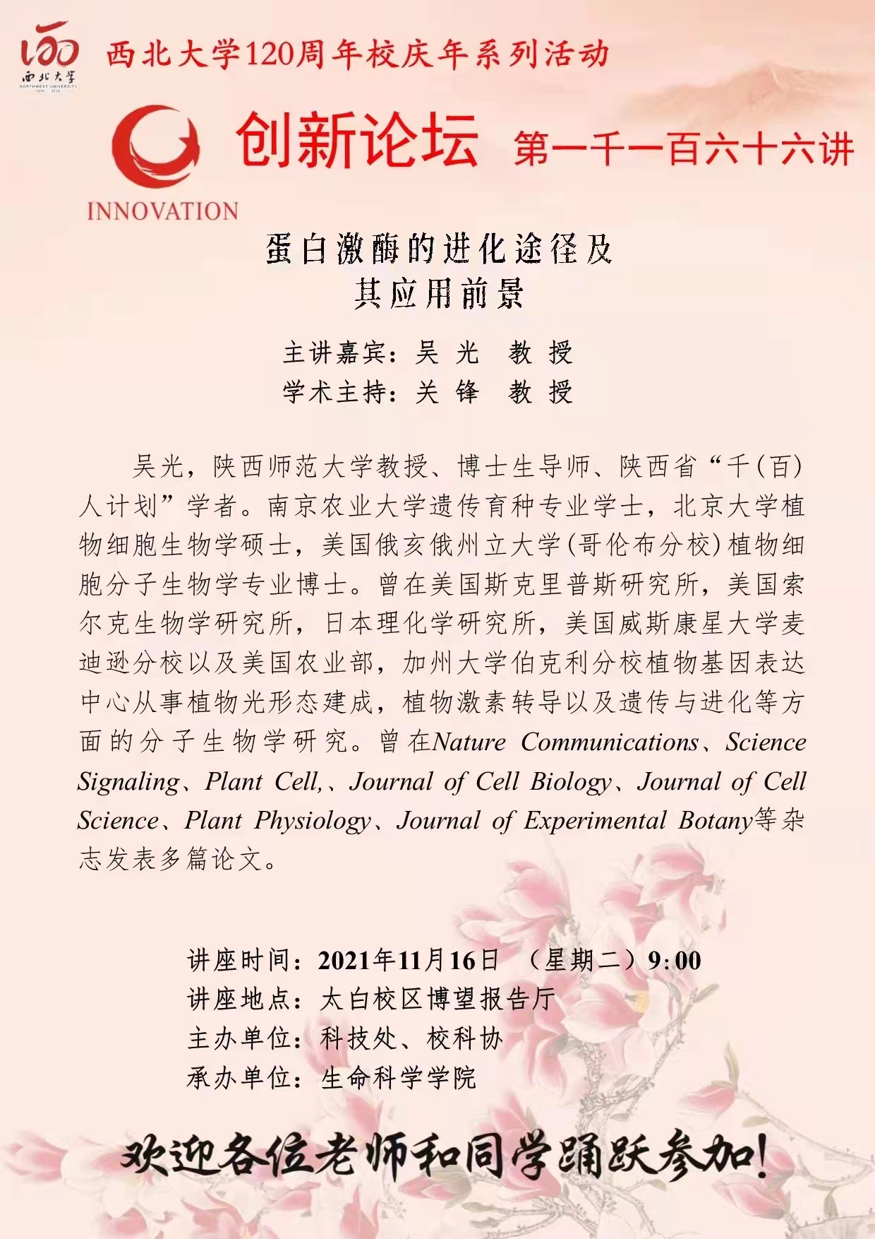 吴光 教授 8868体育登录创新论坛第一千一百六十六讲暨120周年校庆年系列活动:蛋白激酶的进化途径及其应用前景 讲座时间 2021年11月16日 (星期二)9:00 讲座地点 太白校区博望报告厅 讲座人介绍 吴光 教授 讲座内容