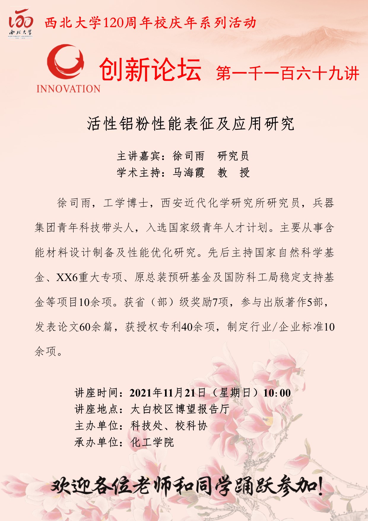 徐司雨 研究员 8868体育登录创新论坛第一千一百六十九讲暨120周年校庆年系列活动:活性铝粉性能表征及应用研究 讲座时间 2021年11月21日(星期日)10:00 讲座地点 太白校区博望报告厅 讲座人介绍 徐司雨 研究员 讲座内容