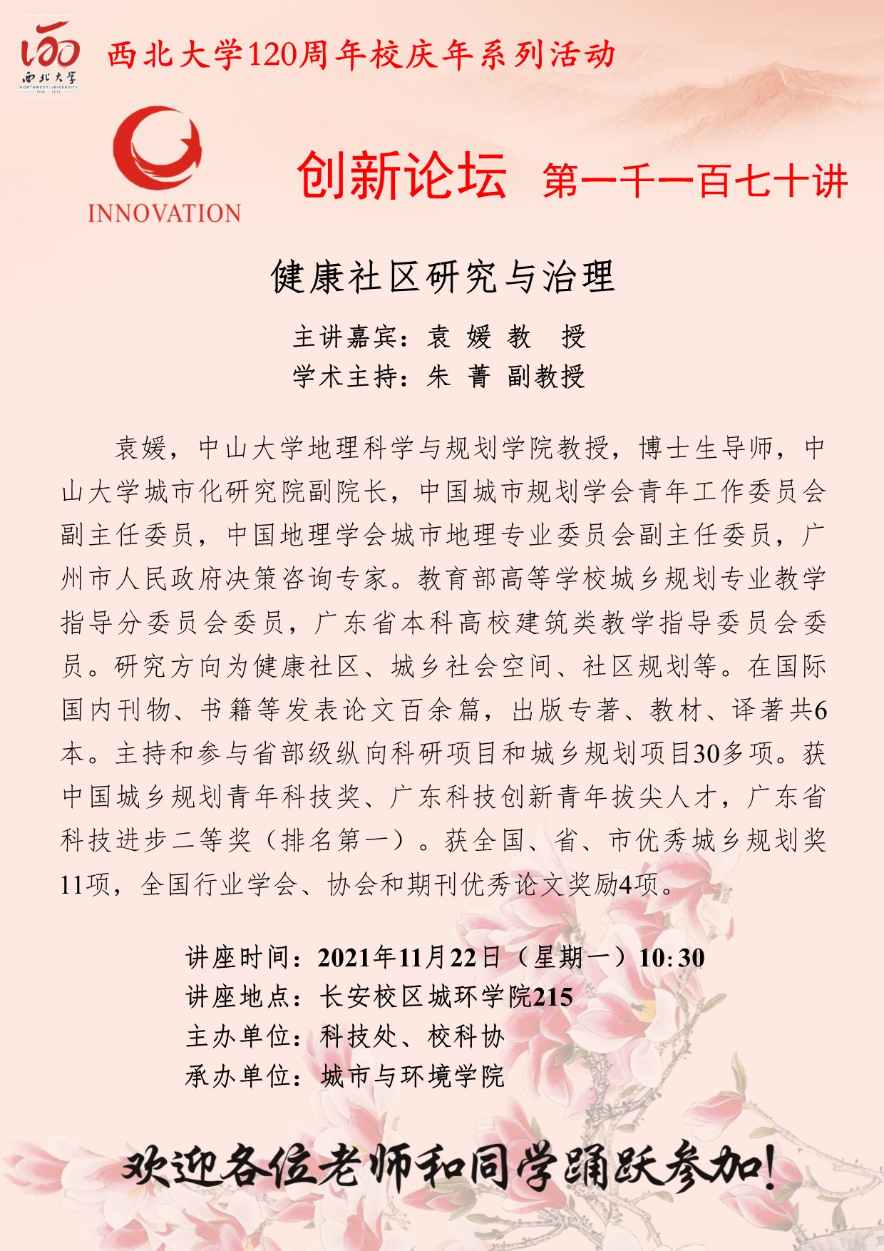 袁媛 教授 8868体育登录创新论坛第一千一百七十讲暨120周年校庆年系列活动:健康社区研究与治理 讲座时间 2021年11月22日(星期一)10:30 讲座地点 长安校区城环学院215 讲座人介绍 袁媛 教授 讲座内容