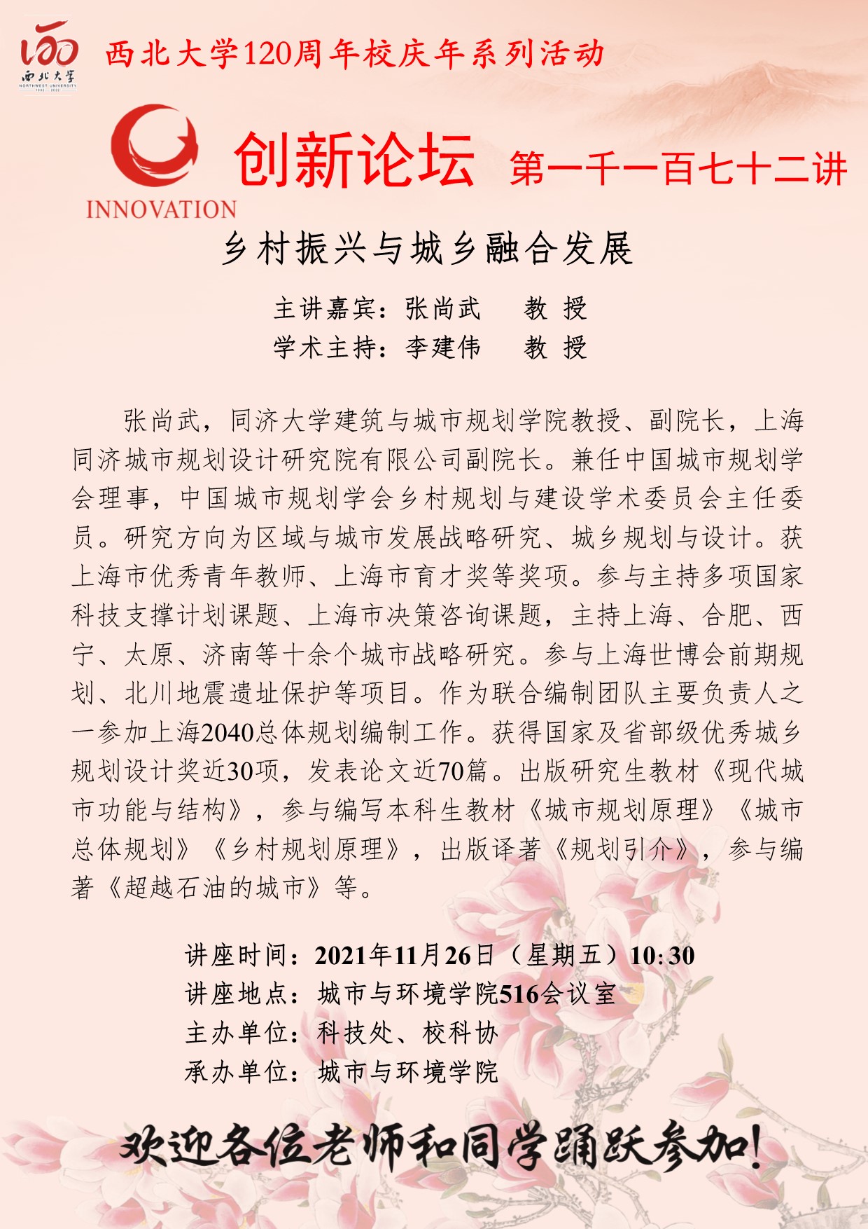 张尚武 教授 8868体育登录创新论坛第一千一百七十二讲暨120周年校庆年系列活动:乡村振兴与城乡融合发展 讲座时间 2021年11月26日(星期五)10:30 讲座地点 城市与环境学院516会议室 讲座人介绍 张尚武 教授 讲座内容
