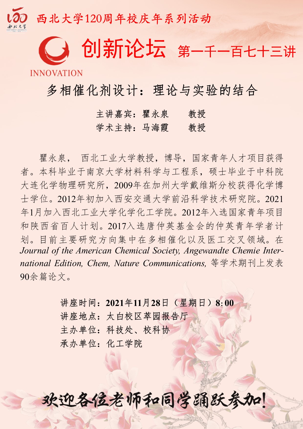 瞿永泉 教授 8868体育登录创新论坛第一千一百七十三讲暨120周年校庆年系列活动:多相催化剂设计:理论与实验的结合 讲座时间 2021年11月28日(星期日)8:00 讲座地点 太白校区萃园报告厅 讲座人介绍 瞿永泉 教授 讲座内容