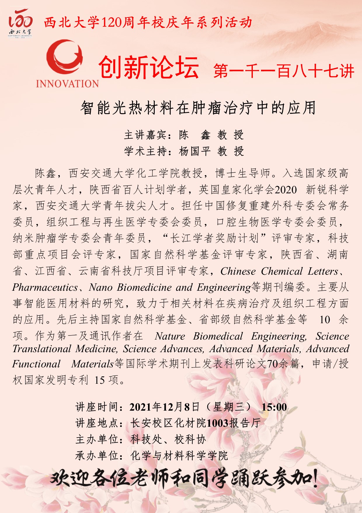 陈鑫 教授 8868体育登录创新论坛第一千一百八十七讲暨120周年校庆年系列活动:智能光热材料在肿瘤治疗中的应用 讲座时间 2021年12月8日(星期三) 15:00 讲座地点 长安校区化材院1003报告厅 讲座人介绍 陈鑫 教授 讲座内容