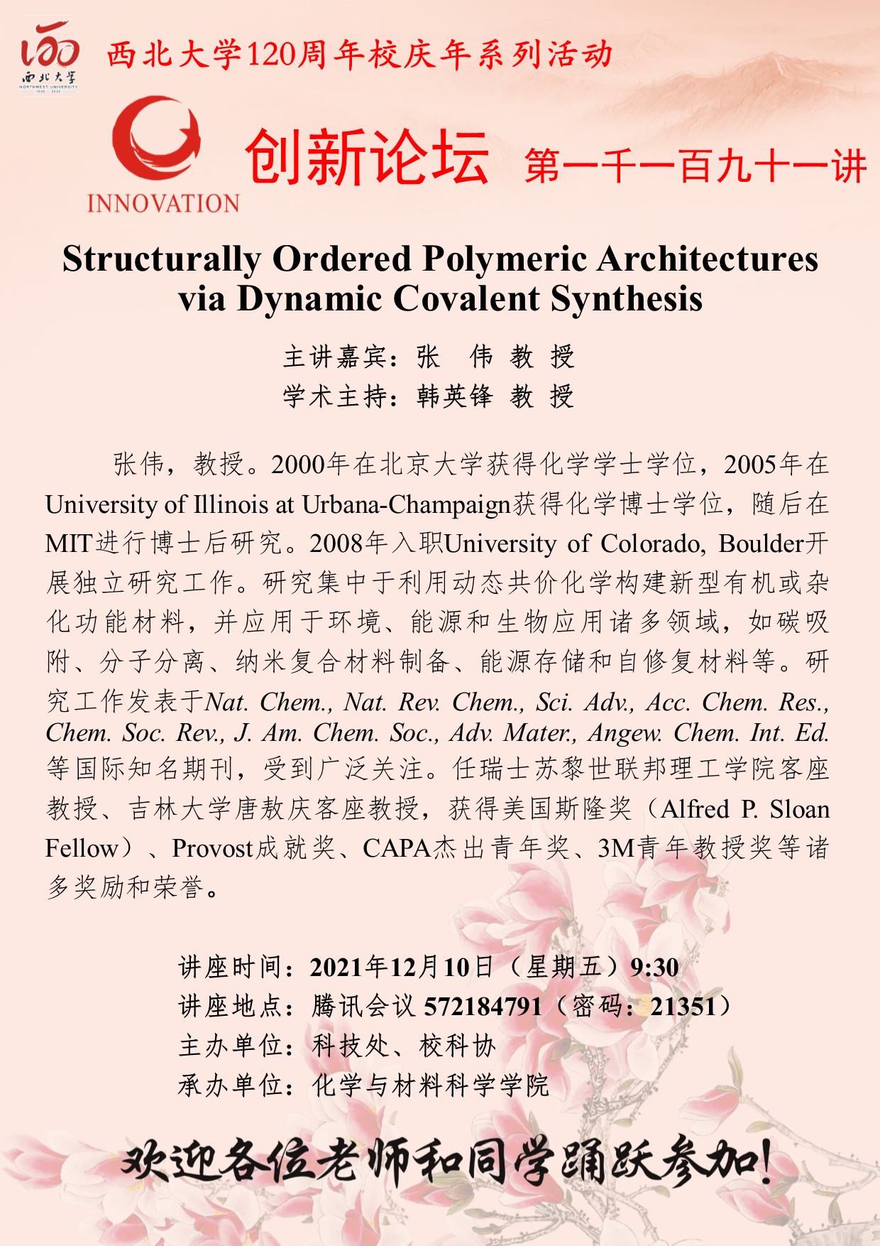张伟 教授 8868体育登录创新论坛第一千一百九十一讲暨120周年校庆年系列活动:Structurally Ordered Polymeric Architectures via Dynamic Covalent Synthesis 讲座时间 2021年12月10日(星期五)9:30 讲座地点 腾讯会议 572184791(密码:21351) 讲座人介绍 张伟 教授 讲座内容