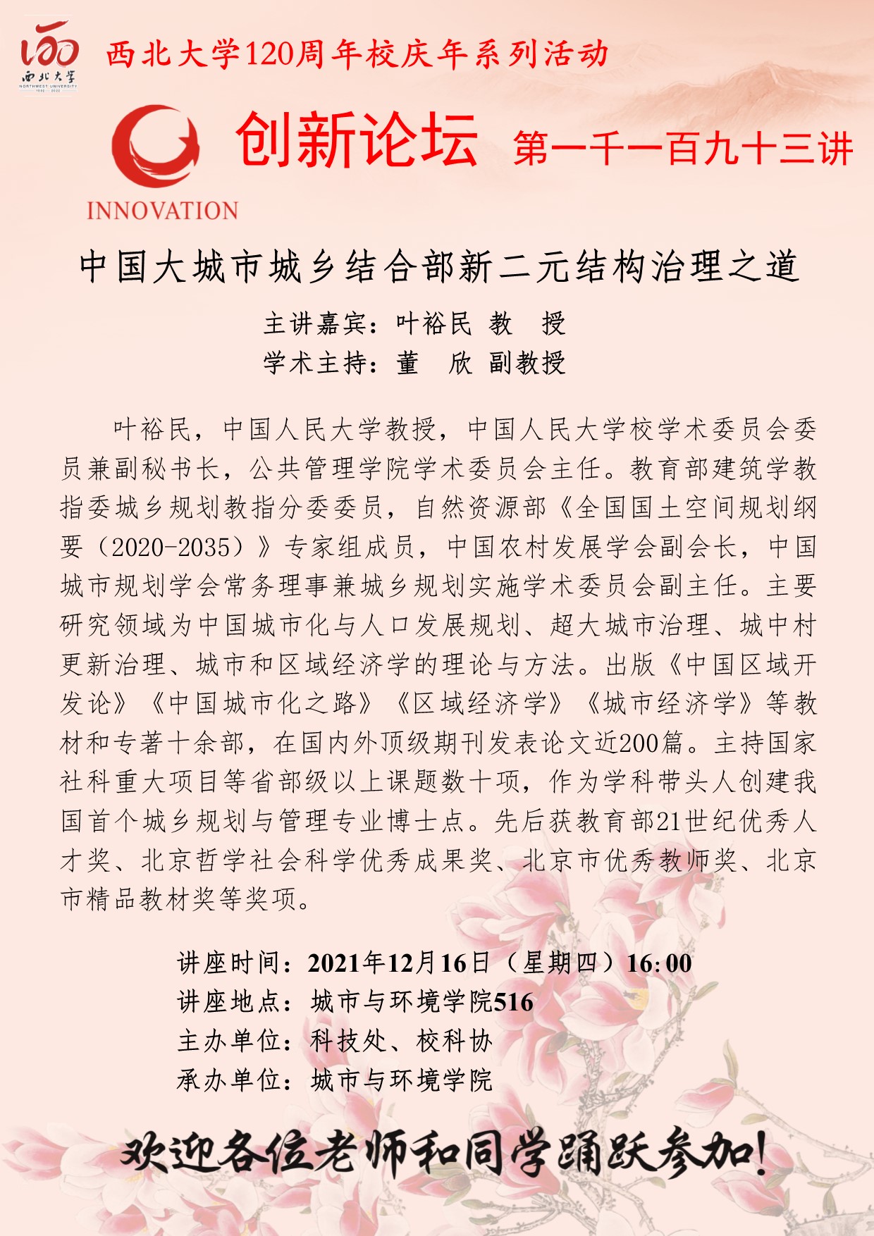 叶裕民 教授 8868体育登录创新论坛第一千一百九十三讲暨120周年校庆年系列活动:中国大城市城乡结合部新二元结构治理之道 讲座时间 2021年12月16日(星期四)16:00 讲座地点 城市与环境学院516 讲座人介绍 叶裕民 教授 讲座内容