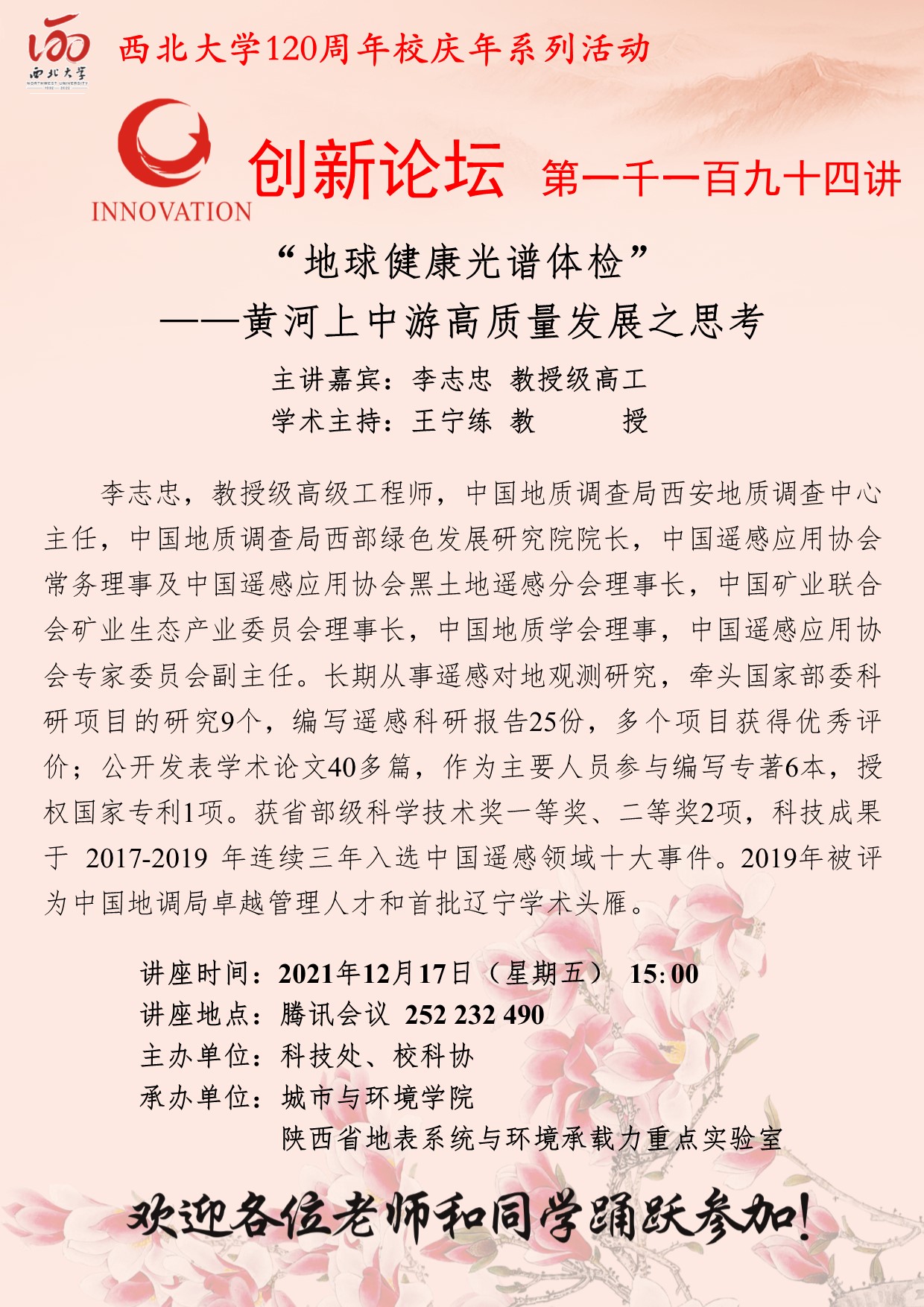李志忠 教授级高工 8868体育登录创新论坛第一千一百九十四讲暨120周年校庆年系列活动:“地球健康光谱体检”——黄河上中游高质量发展之思考 讲座时间 2021年12月17日(星期五) 15:00 讲座地点 腾讯会议 252232490 讲座人介绍 李志忠 教授级高工 讲座内容