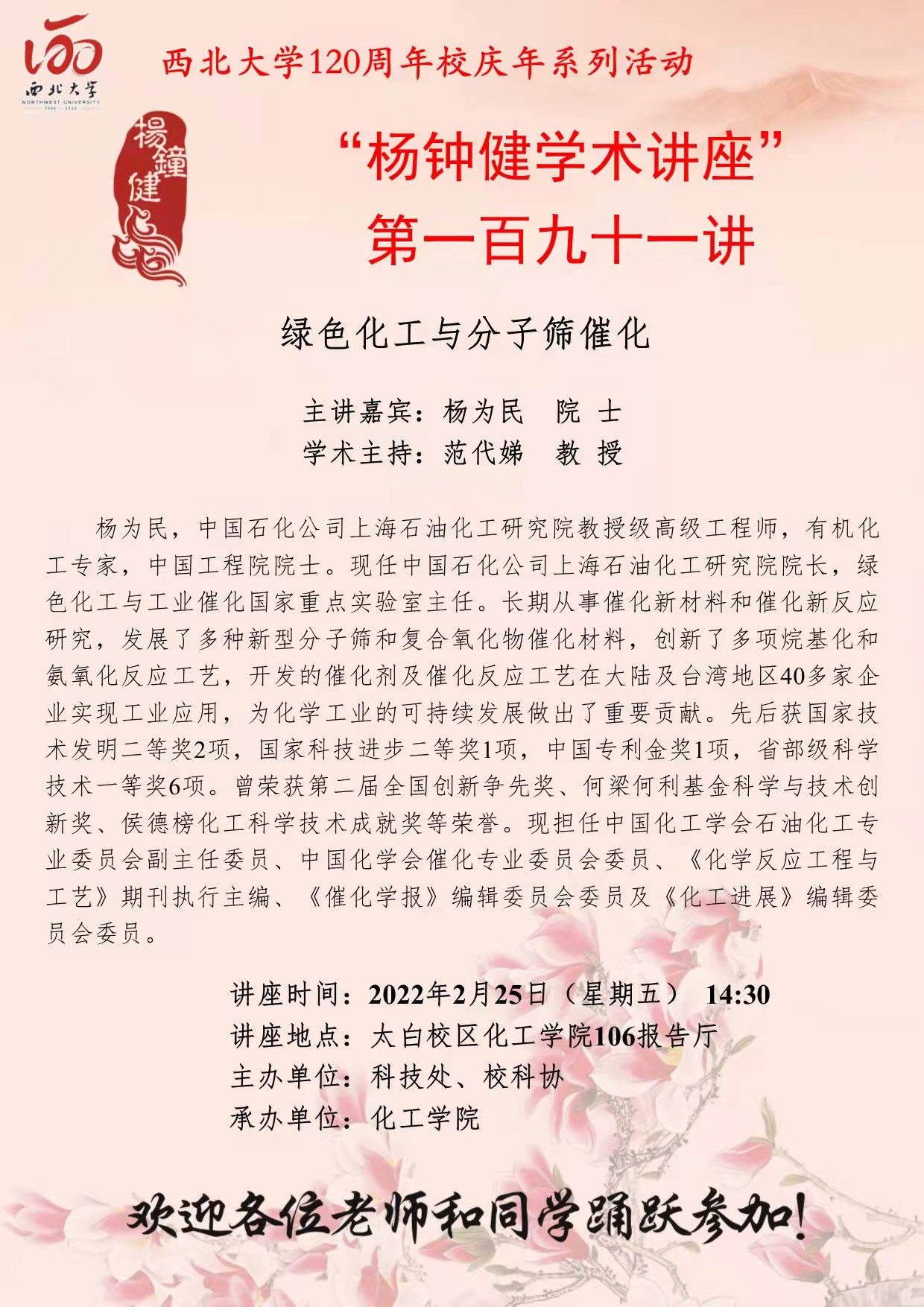 “杨钟健学术讲座”第一百九十一讲暨120周年校庆年系列活动:绿色化工与分子筛催化