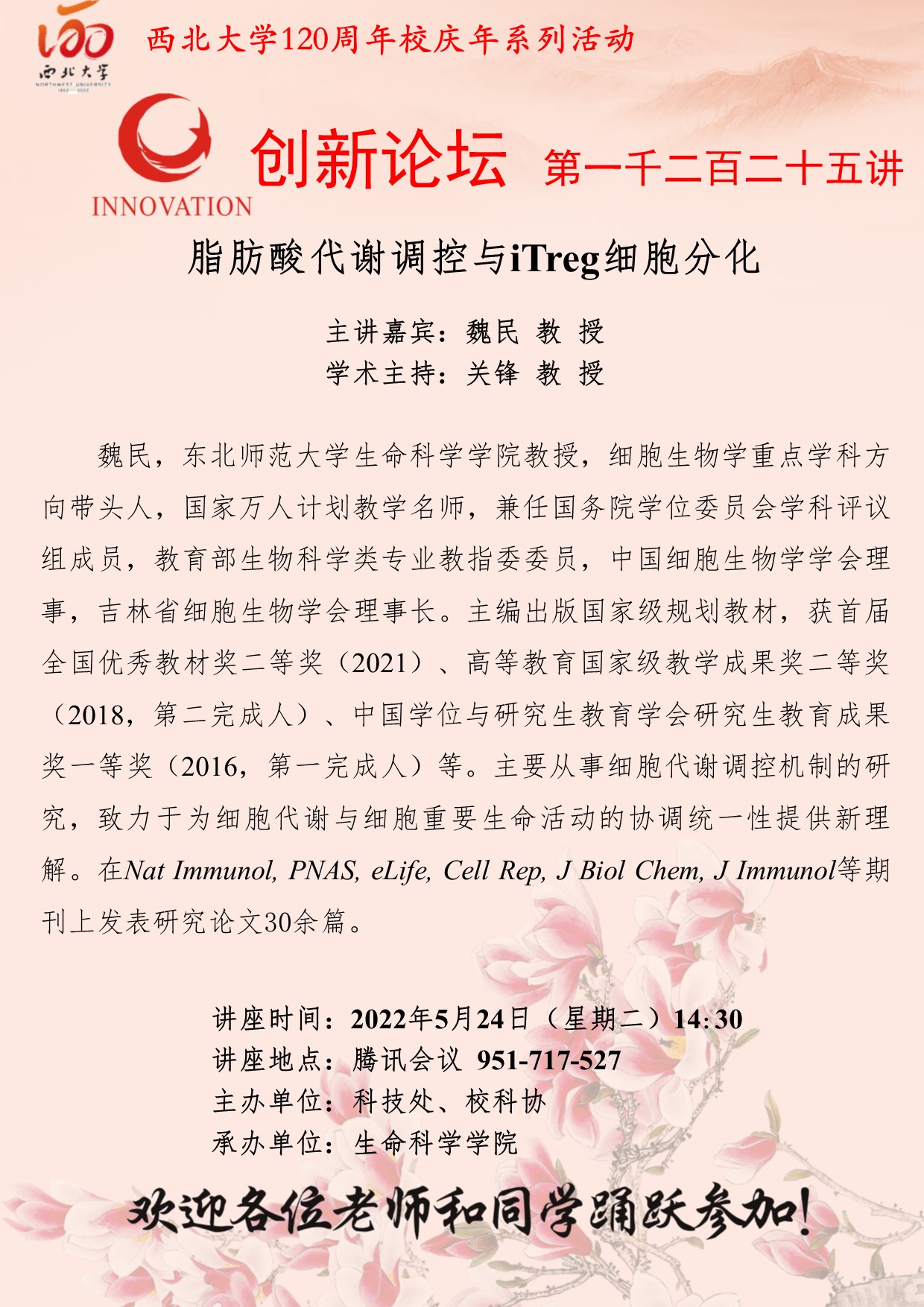 魏民 教授 8868体育登录创新论坛第一千二百二十五讲暨120周年校庆年系列活动:脂肪酸代谢调控与iTreg细胞分化 讲座时间 2022年5月24日(星期二)14:30 讲座地点 腾讯会议 951-717-527 讲座人介绍 魏民 教授 讲座内容