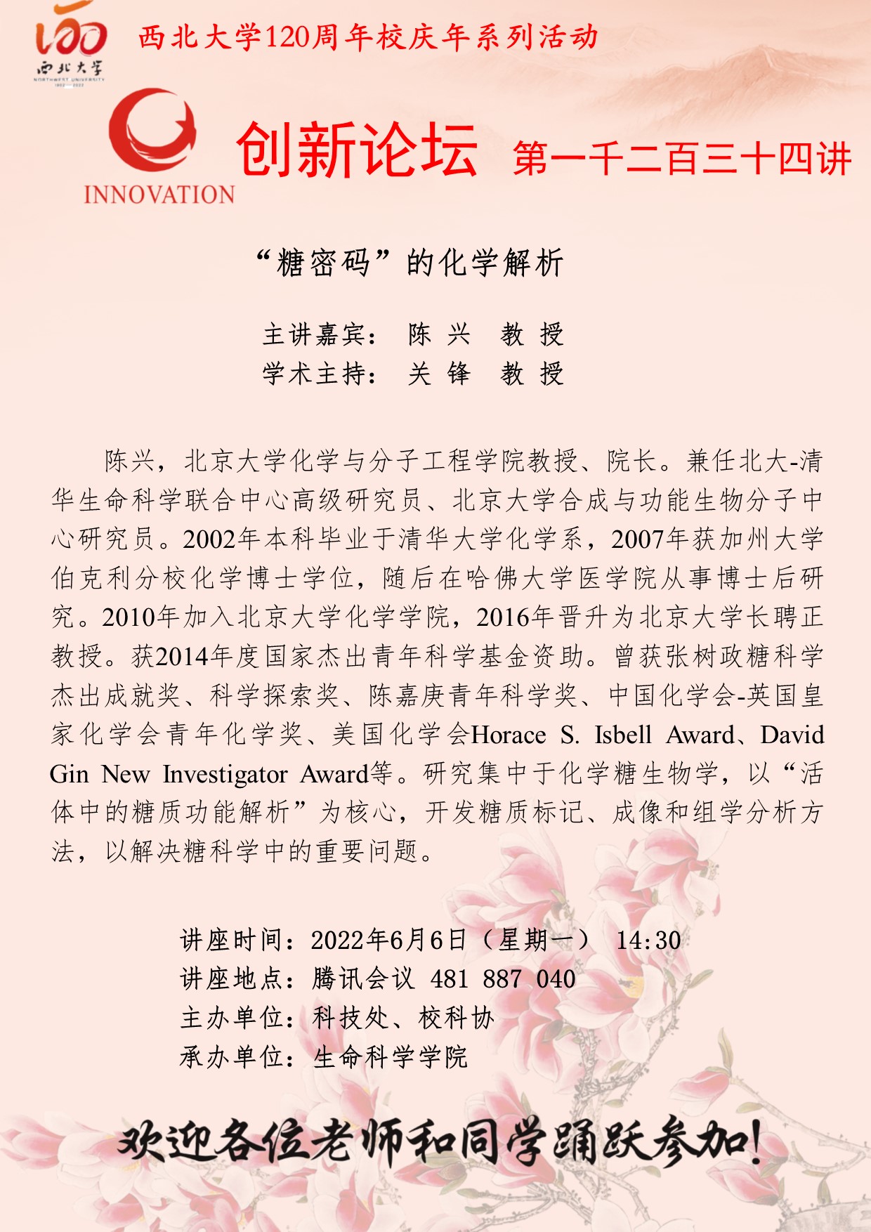 陈兴 教授 8868体育登录创新论坛第一千二百三十四讲暨120周年校庆年系列活动:“糖密码”的化学解析 讲座时间 2022年6月6日(星期一) 14:30 讲座地点 腾讯会议 481 887 040 讲座人介绍 陈兴 教授 讲座内容