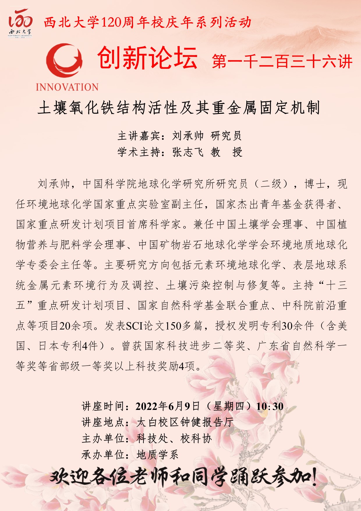 刘承帅 研究员 8868体育登录创新论坛第一千二百三十六讲暨120周年校庆年系列活动:土壤氧化铁结构活性及其重金属固定机制 讲座时间 2022年6月9日(星期四)10:30 讲座地点 太白校区钟健报告厅 讲座人介绍 刘承帅 研究员 讲座内容
