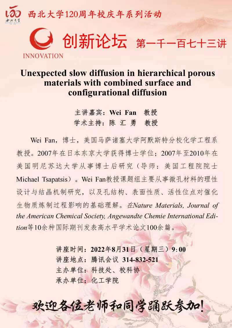 Wei Fan 教授 8868体育登录创新论坛第一千二百七十三讲暨120周年校庆年系列活动: Unexpected slow diffusion in hierarchical porous materials with combined surface and configurational diffusion 讲座时间 2022年8月31日(星期三)9:00 讲座地点 腾讯会议 314-832-521 讲座人介绍 Wei Fan 教授 讲座内容