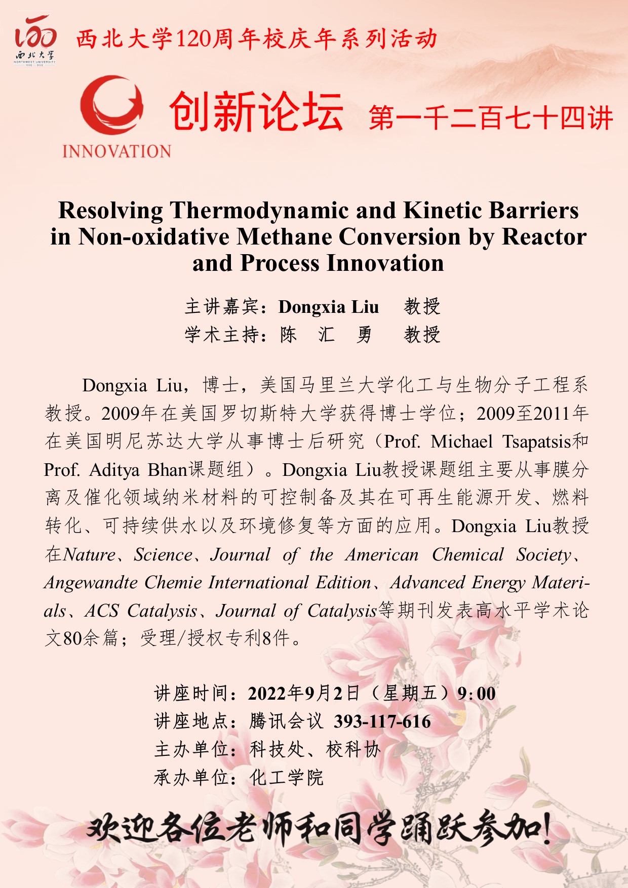 Dongxia Liu 教授 8868体育登录创新论坛第一千二百七十四讲暨120周年校庆年系列活动:Resolving Thermodynamic and Kinetic Barriers in Non-oxidative Methane Conversion by Reactor and Process Innovation 讲座时间 2022年9月2日(星期五)9:00 讲座地点 腾讯会议 393-117-616 讲座人介绍 Dongxia Liu 教授 讲座内容