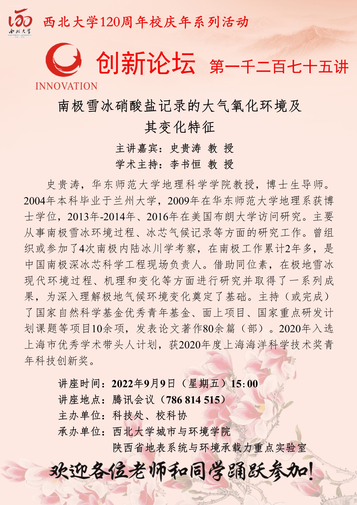 史贵涛 教 授 8868体育登录创新论坛第一千二百七十五讲暨120周年校庆年系列活动:南极雪冰硝酸盐记录的大气氧化环境及其变化特征 讲座时间 2022年9月9日(星期五)15:00 讲座地点 讲座地点:腾讯会议(786 814 515) 讲座人介绍 史贵涛 教 授 讲座内容