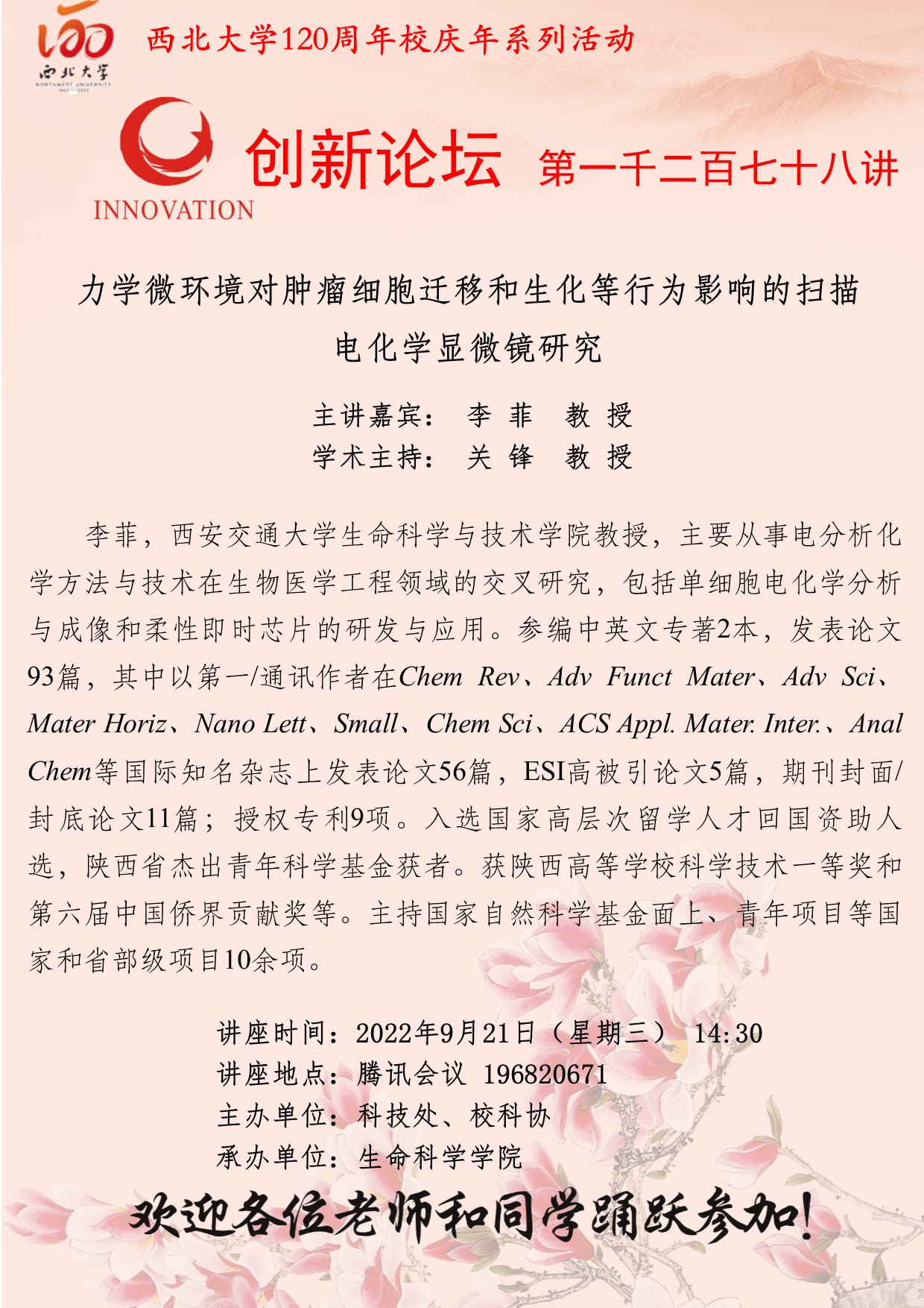李 菲 教 授 8868体育登录创新论坛第一千二百七十八讲暨120周年校庆年系列活动:力学微环境对肿瘤细胞迁移和生化等行为影响的扫描电化学显微镜研究 讲座时间 2022年9月21日(星期三) 14:30 讲座地点 腾讯会议 196820671 讲座人介绍 李 菲 教 授 讲座内容