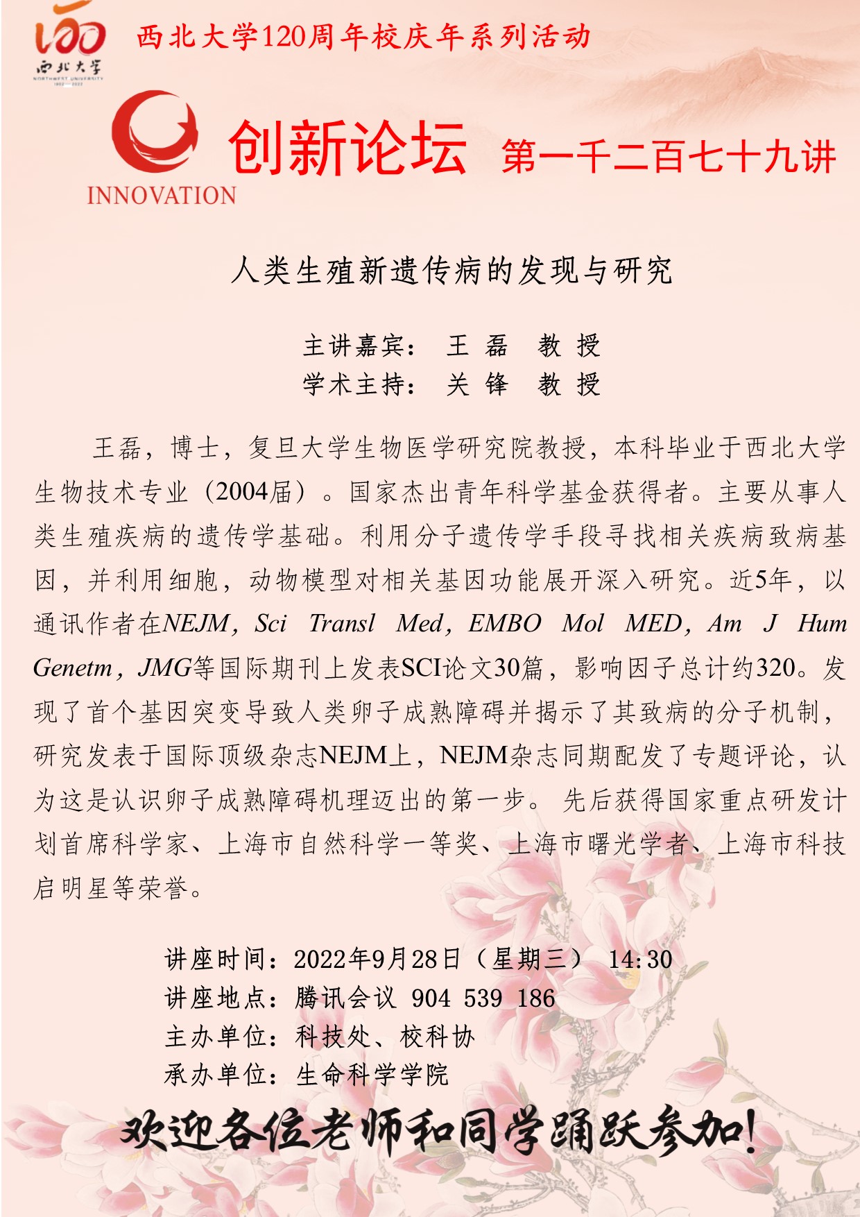 王 磊 教 授 8868体育登录创新论坛第一千二百七十九讲暨120周年校庆年系列活动:人类生殖新遗传病的发现与研究 讲座时间 2022年9月28日(星期三) 14:30 讲座地点 腾讯会议 904 539 186 讲座人介绍 王 磊 教 授 讲座内容
