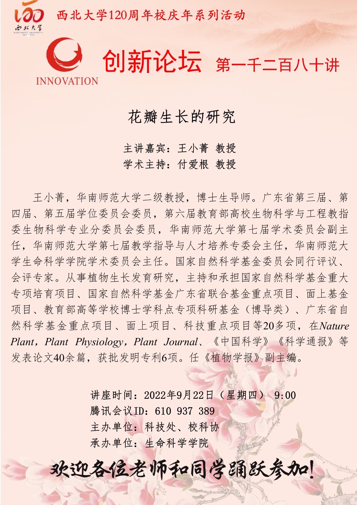 王小菁 教授 8868体育登录创新论坛第一千二百八十讲暨120周年校庆年系列活动:花瓣生长的研究 讲座时间 2022年9月22日(星期四) 9:00 讲座地点 腾讯会议ID:610 937 389 讲座人介绍 王小菁 教授 讲座内容