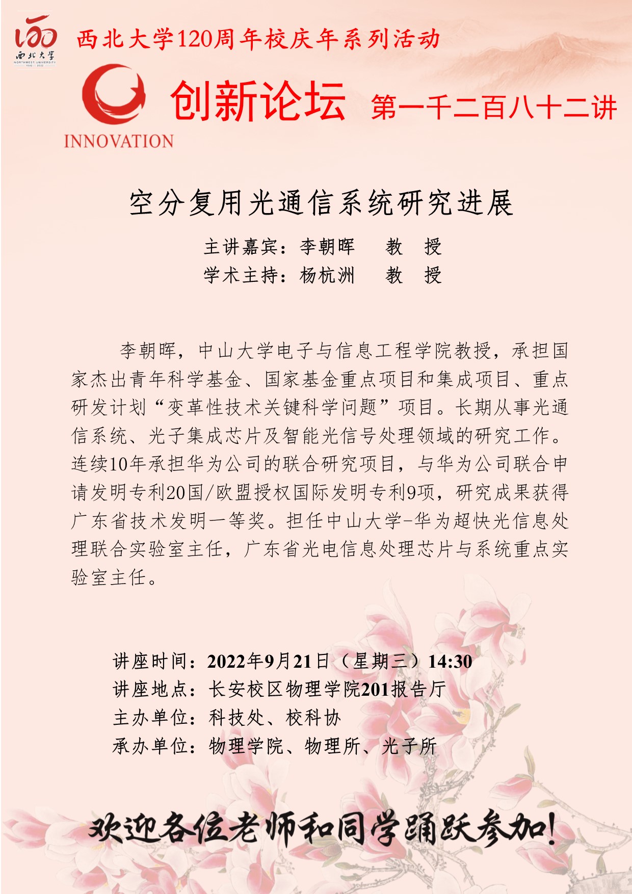 李朝晖 教授 8868体育登录创新论坛第一千二百八十二讲暨120周年校庆年系列活动::空分复用光通信系统研究进展 讲座时间 2022年9月21日(星期三) 14:30 讲座地点 物理学院201报告厅 讲座人介绍 李朝晖 教授 讲座内容