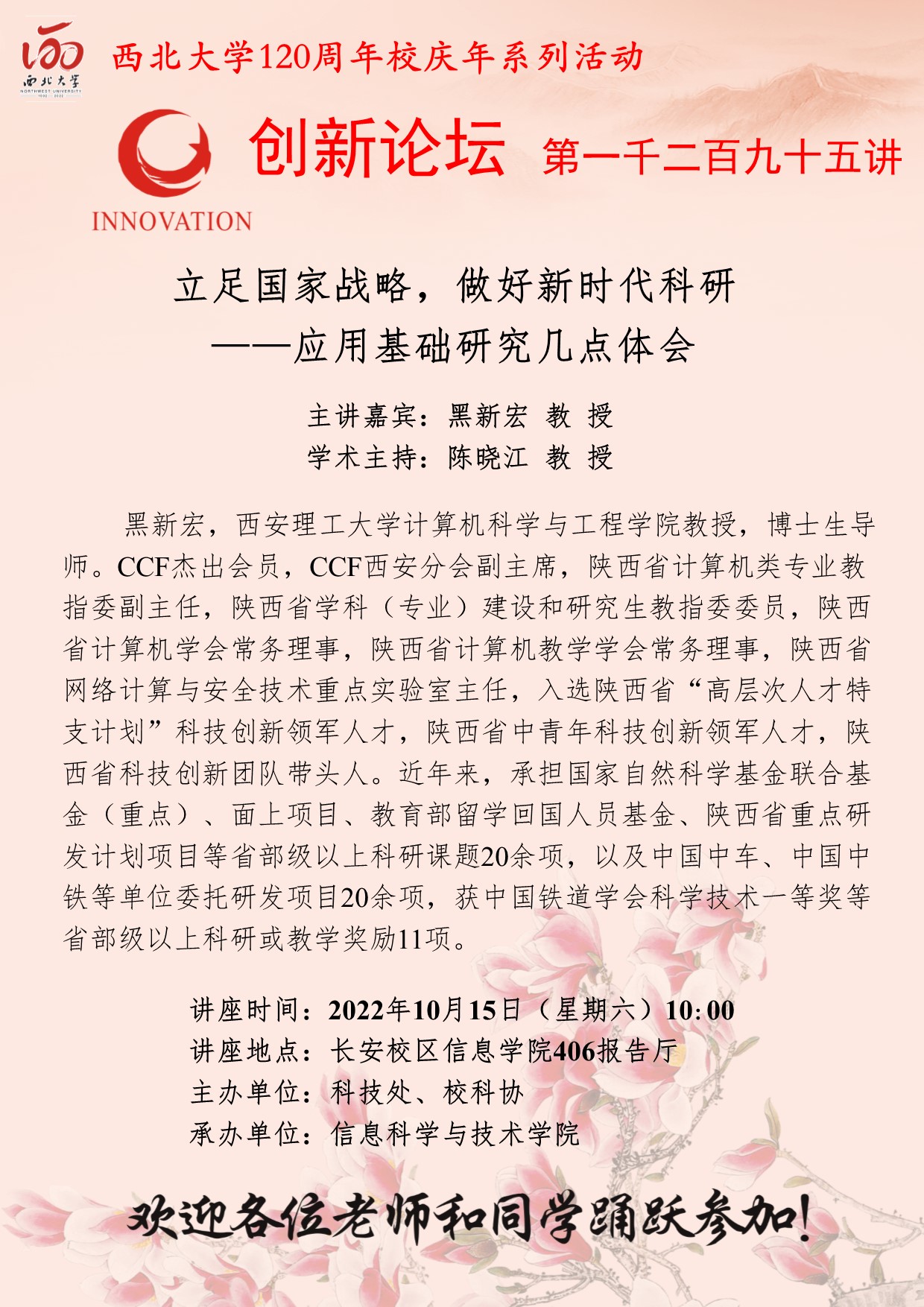 黑新宏 教授 8868体育登录创新论坛第一千二百九十五讲暨120周年校庆年系列活动: 立足国家战略,做好新时代科研——应用基础研究几点体会 讲座时间 2022年10月15日(星期六)10:00 讲座地点 长安校区信息学院406报告厅 讲座人介绍 黑新宏 教授 讲座内容