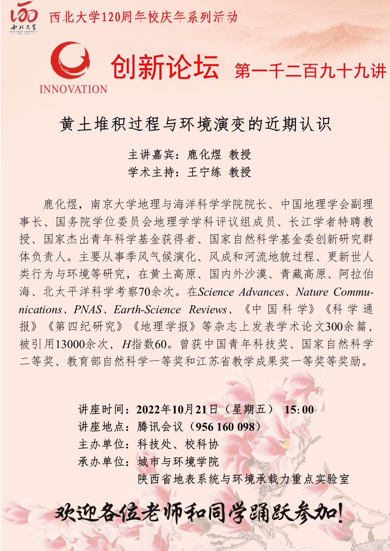 鹿化煜 教授 8868体育登录创新论坛第一千二百九十九讲暨120周年校庆年系列活动:黄土堆积过程与环境演变的近期认识 讲座时间 2022年10月21日(星期五) 15:00 讲座地点 腾讯会议(956 160 098) 讲座人介绍 鹿化煜 教授 讲座内容