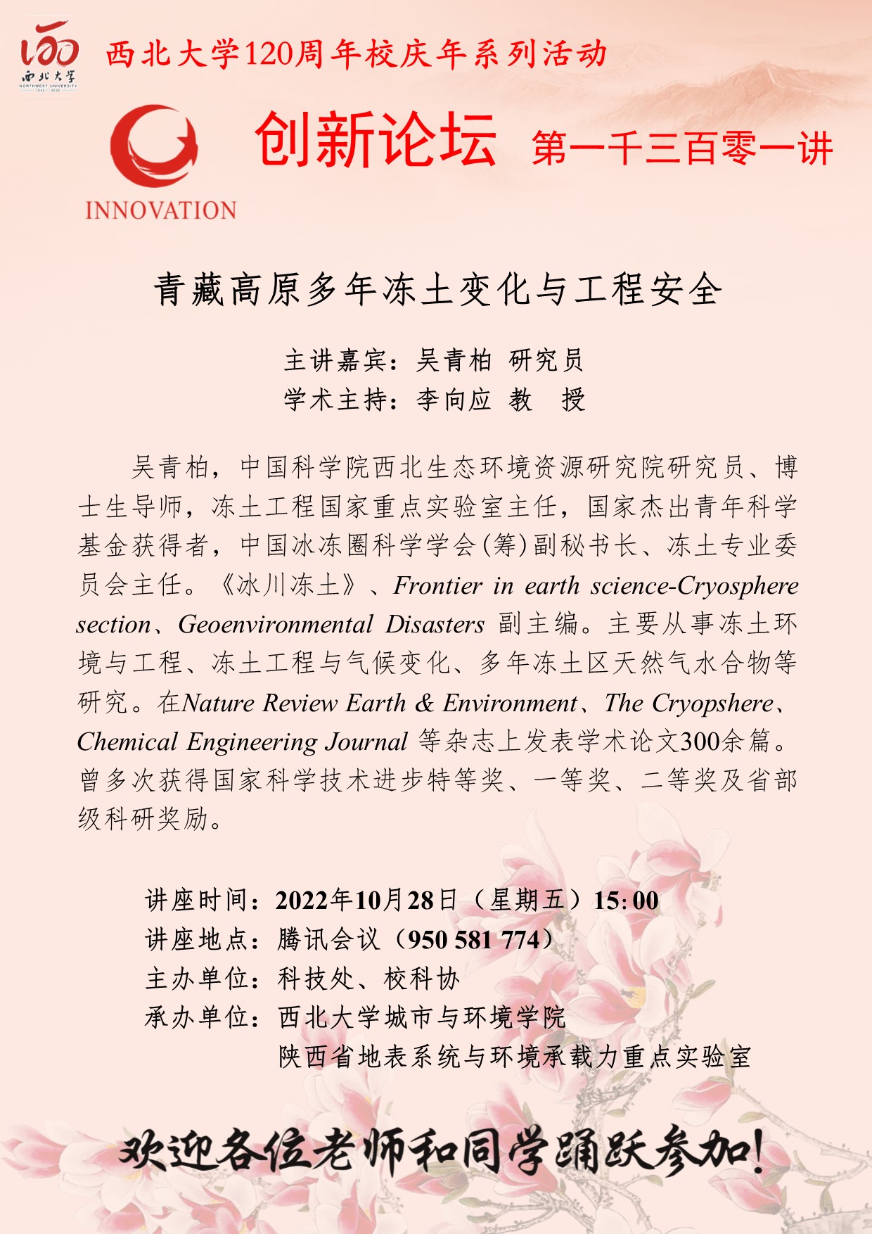 吴青柏 研究员 8868体育登录创新论坛第一千三百零一讲暨120周年校庆年系列活动: 青藏高原多年冻土变化与工程安全 讲座时间 2022年10月28日(星期五)15:00 讲座地点 腾讯会议 950 581 774 讲座人介绍 吴青柏 研究员 讲座内容