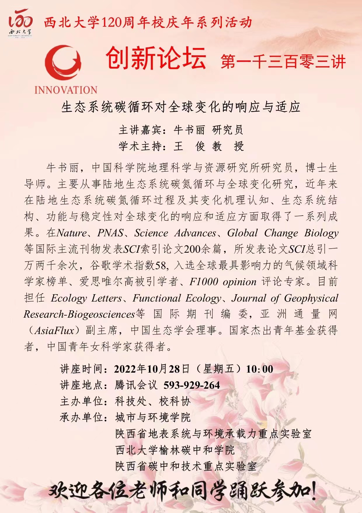 牛书丽 研究员 8868体育登录创新论坛第一千三百零三讲暨120周年校庆年系列活动: 生态系统碳循环对全球变化的响应与适应 讲座时间 2022年10月28日(星期五) 10:00 讲座地点 腾讯会议 593-929-264 讲座人介绍 牛书丽 研究员 讲座内容