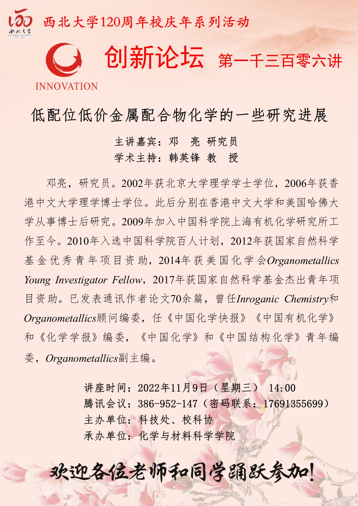 邓亮 研究员 8868体育登录创新论坛第一千三百零六讲暨120周年校庆年系列活动: 低配位低价金属配合物化学的一些研究进展 讲座时间 2022年11月9日(星期三) 14:00 讲座地点 腾讯会议 386-952-147 讲座人介绍 邓亮 研究员 讲座内容