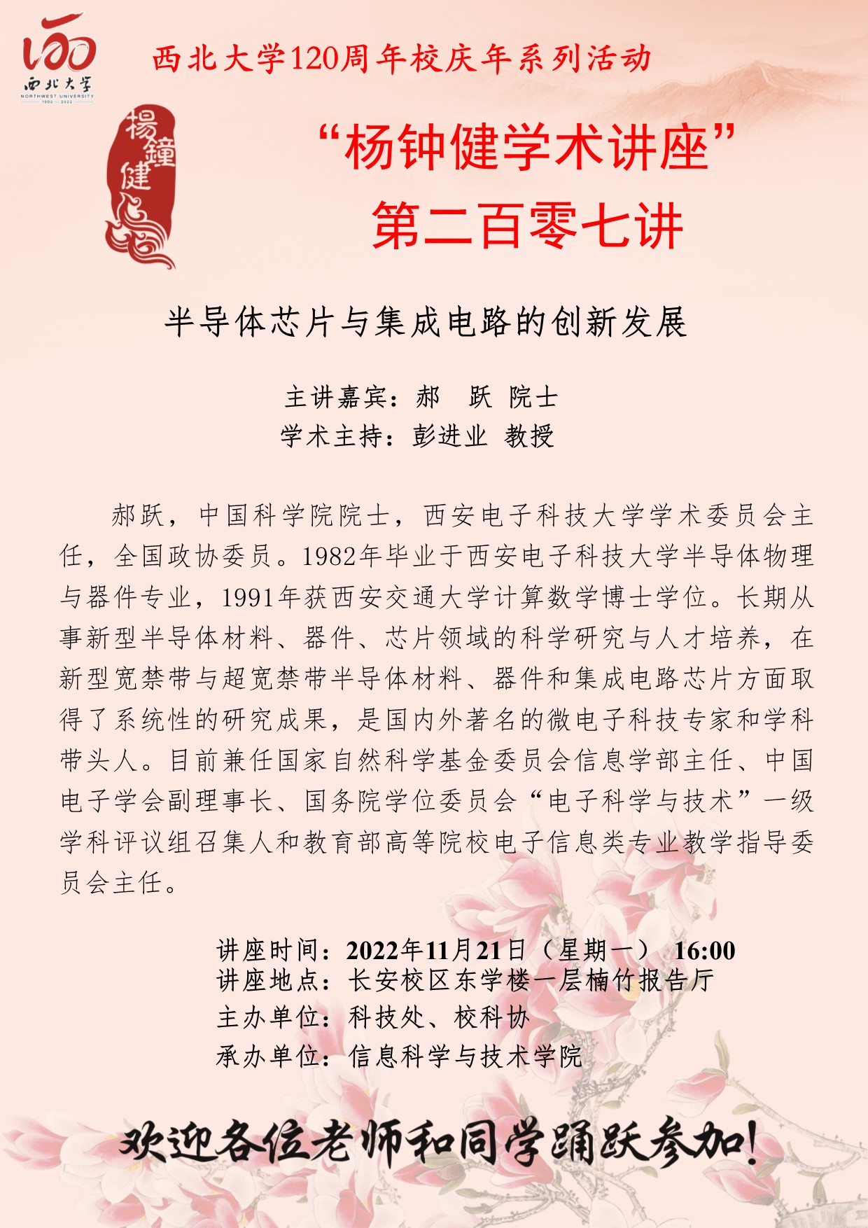 郝跃 院士 “杨钟健学术讲座”第二百零七讲暨120周年校庆年系列活动:半导体芯片与集成电路的创新发展 讲座时间 2022年11月21日(星期一) 16:00 讲座地点 长安校区东学楼一层楠竹报告厅 讲座人介绍 郝跃 院士 讲座内容