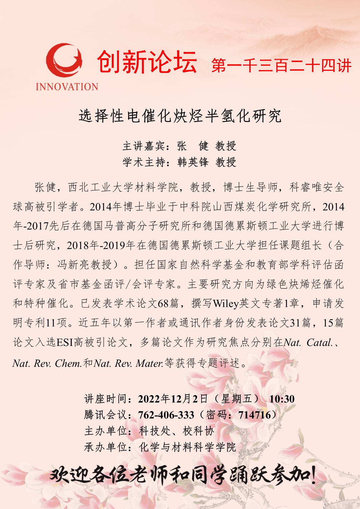 张 健 教授 8868体育登录创新论坛第一千三百二十四讲:选择性电催化炔烃半氢化研究 讲座时间 2022年12月2日(星期五) 10:30 讲座地点 腾讯会议762-406-333(密码:714716) 讲座人介绍 张 健 教授 讲座内容
