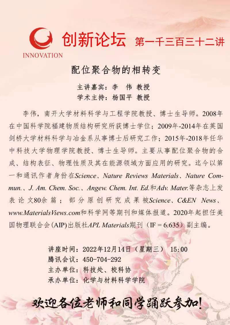 李伟 教授 8868体育登录创新论坛第一千三百三十二讲:配位聚合物的相转变 讲座时间 2022年12月14日(星期三) 15:00 讲座地点 腾讯会议:450-704-292 讲座人介绍 李伟 教授 讲座内容
