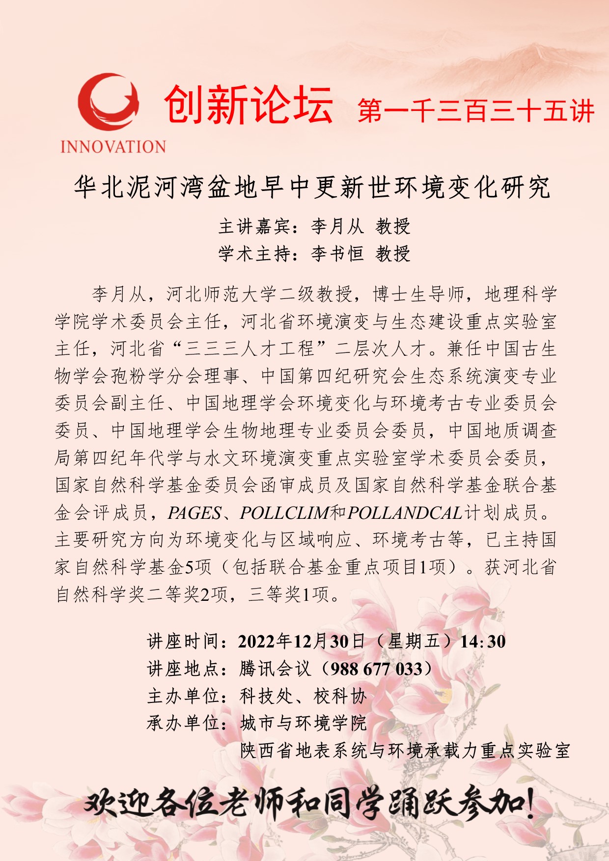 李月从 教授 8868体育登录创新论坛第一千三百三十五讲:华北泥河湾盆地早中更新世环境变化研究 讲座时间 2022年12月30日(星期五)14:30 讲座地点 腾讯会议(988 677 033) 讲座人介绍 李月从 教授 讲座内容