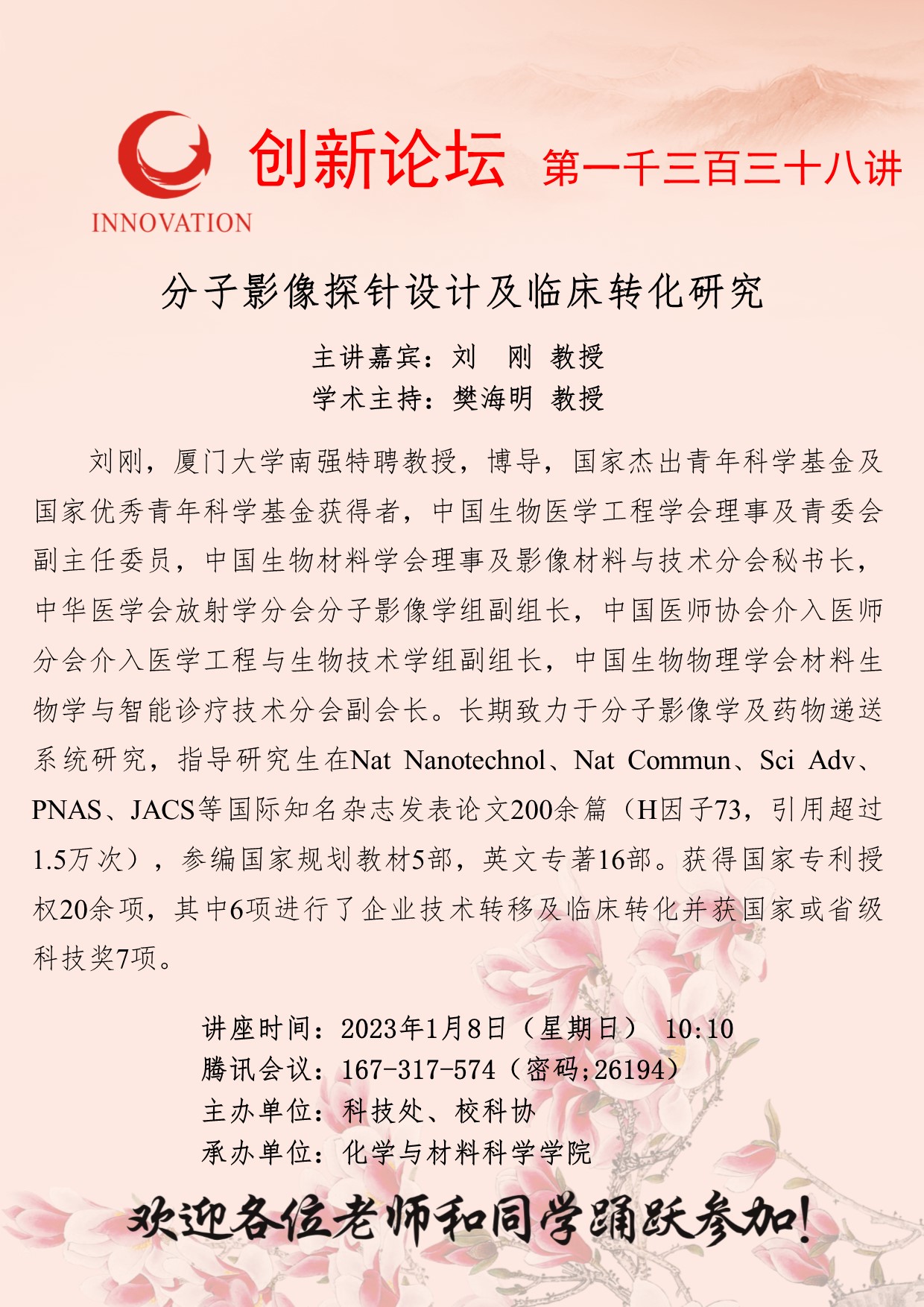 刘刚 教授 8868体育登录创新论坛第一千三百三十八讲:分子影像探针设计及临床转化研究 讲座时间 2023年1月8日(星期日) 10:10 讲座地点 腾讯会议:167-317-574 讲座人介绍 刘刚 教授 讲座内容