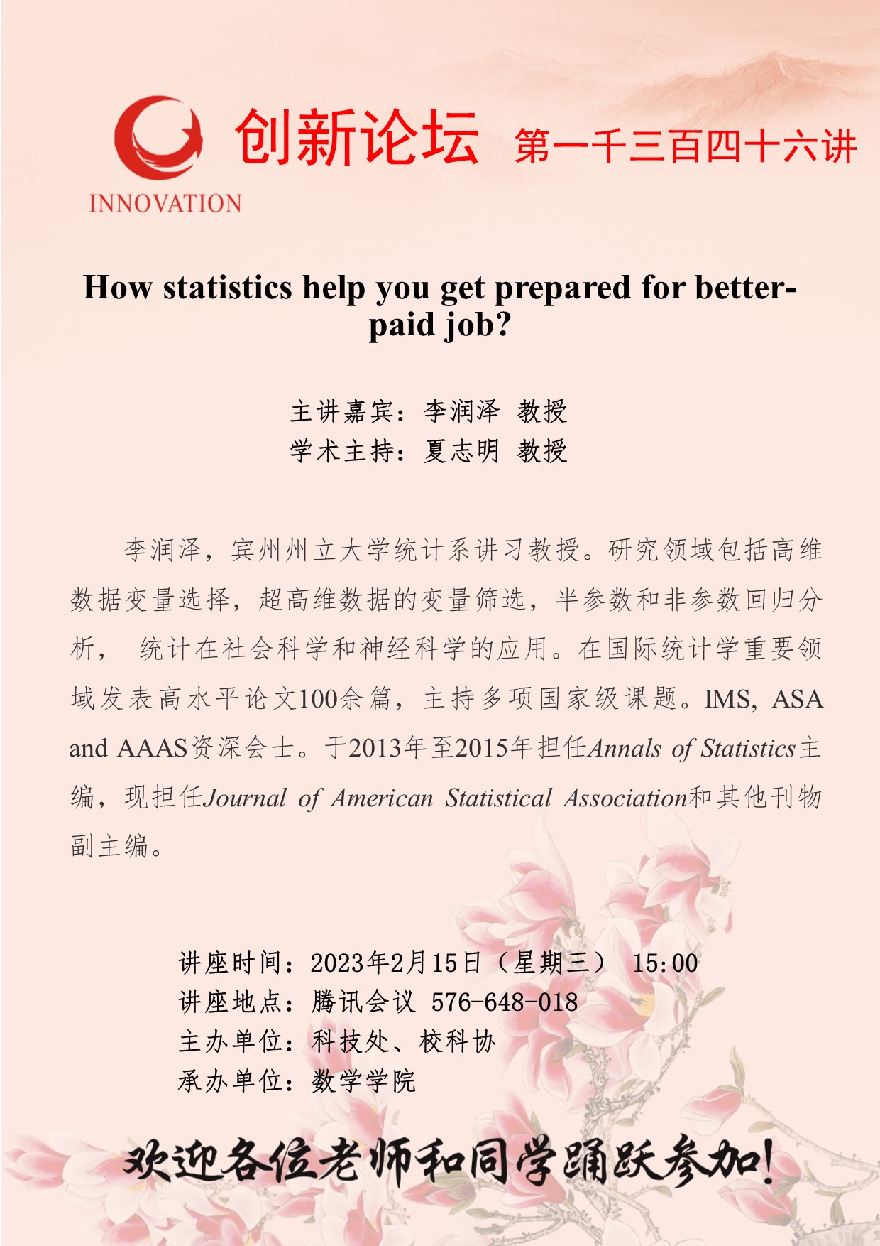 李润泽 教授 8868体育登录创新论坛第一千三百四十六讲:How statistics help you get prepared for better-paid job? 讲座时间 2023年2月15日(星期三) 15:00 讲座地点 腾讯会议 576-648-018 讲座人介绍 李润泽 教授 讲座内容
