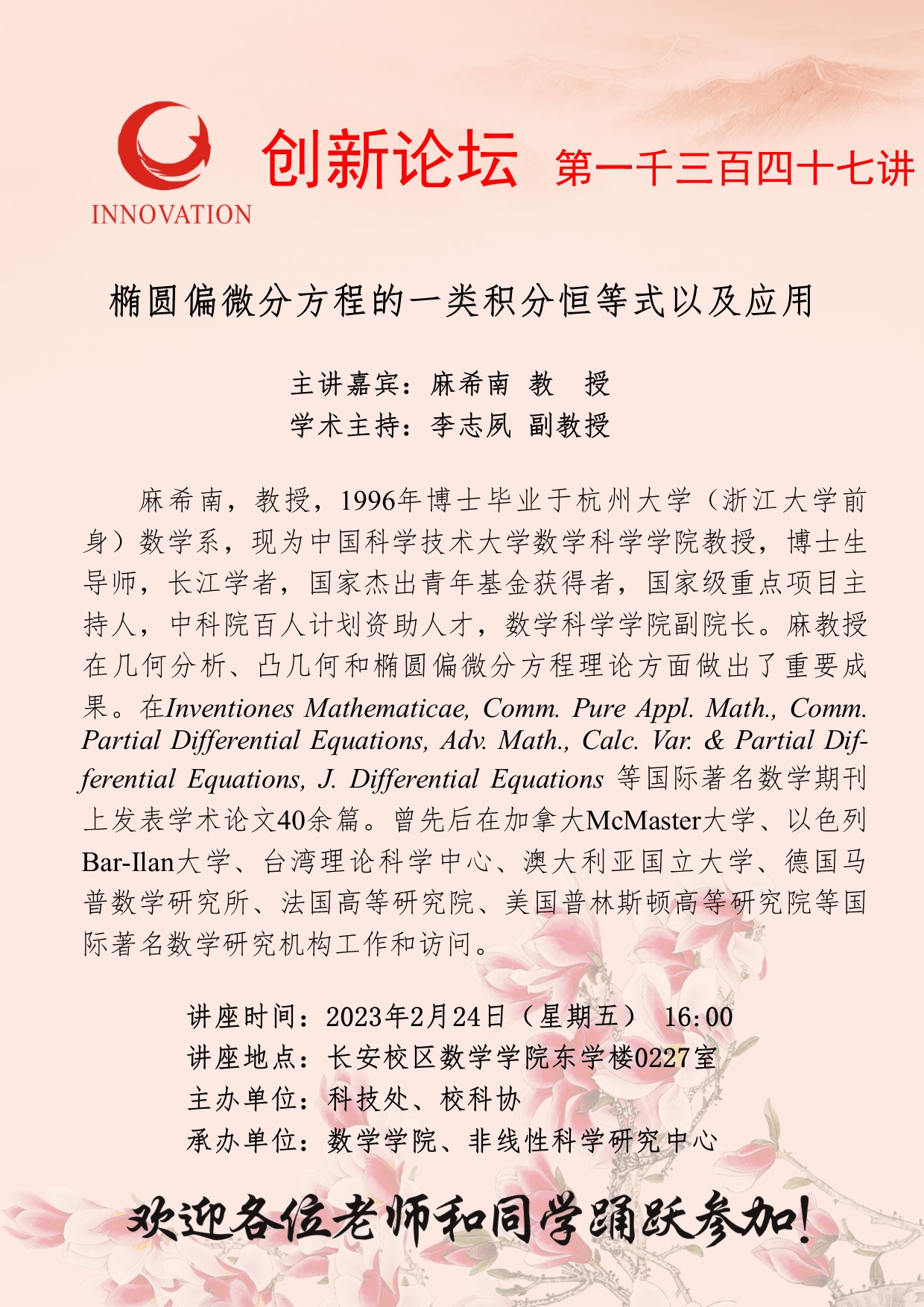 麻希南 教授 8868体育登录创新论坛第一千三百四十七讲: 椭圆偏微分方程的一类积分恒等式以及应用 讲座时间 2023年2月24日(星期五)16:00 讲座地点 长安校区数学学院东学楼0227室 讲座人介绍 麻希南 教授 讲座内容