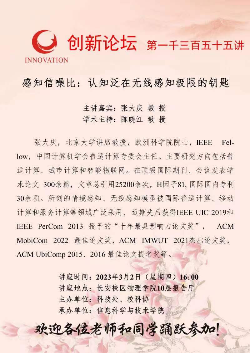 张大庆 教授 8868体育登录创新论坛第一千三百五十五讲:感知信噪比:认知泛在无线感知极限的钥匙 讲座时间 2023年3月2日(星期四)16:00 讲座地点 长安校区物理学院10层报告厅 讲座人介绍 张大庆 教授 讲座内容
