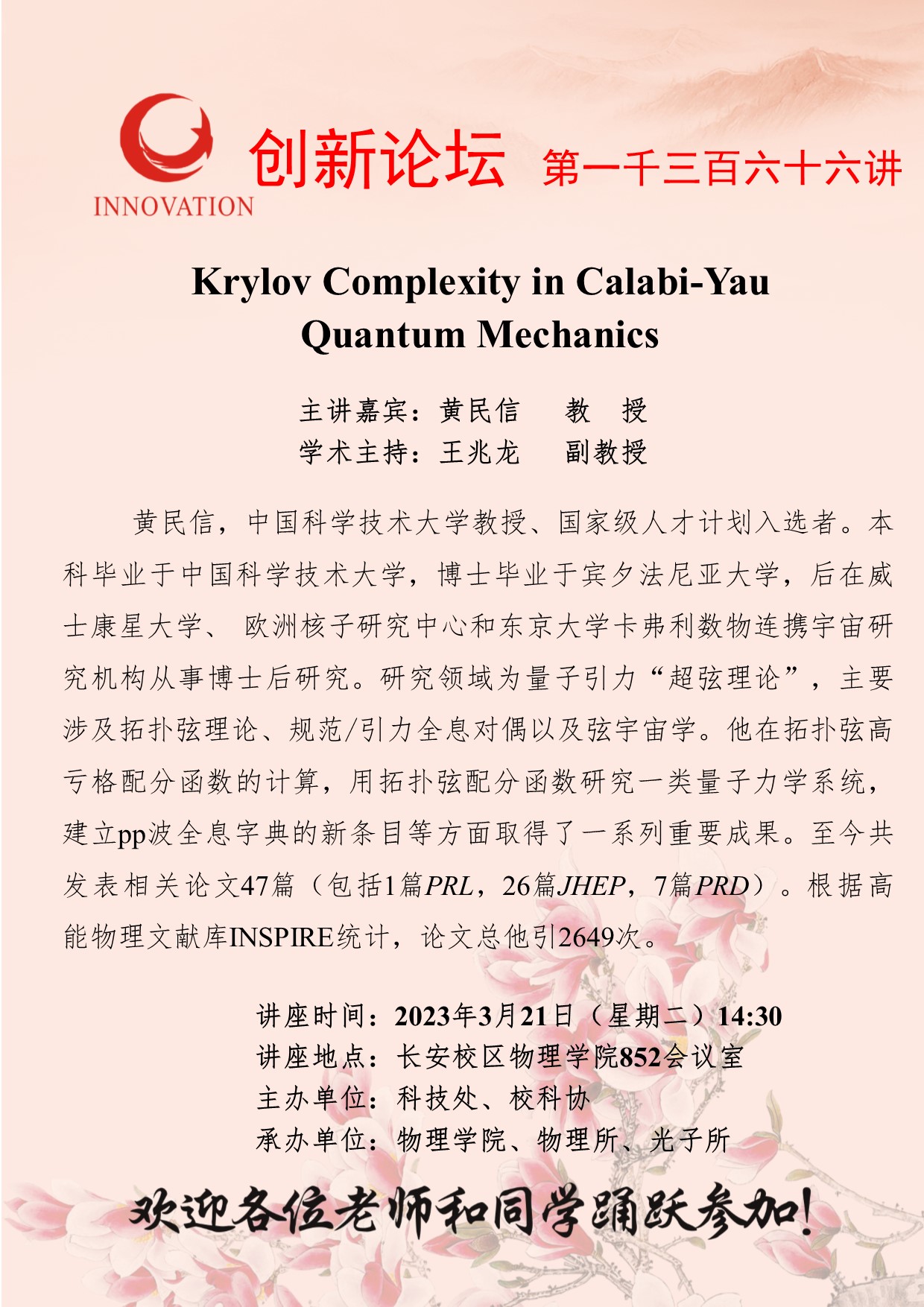 黄民信 教授 8868体育登录创新论坛第一千三百六十六讲:Krylov Complexity in Calabi-Yau Quantum Mechanics 讲座时间 2023年3月21日(星期二)14:30 讲座地点 长安校区物理学院852会议室 讲座人介绍 黄民信 教授 讲座内容