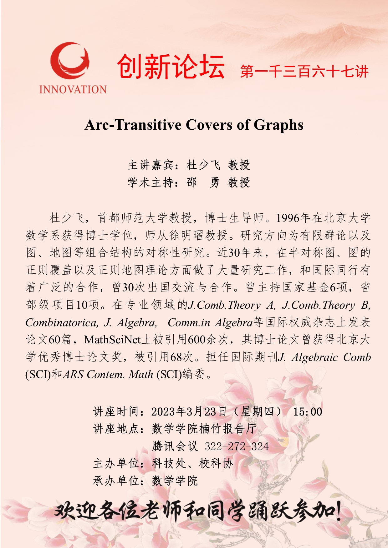 杜少飞 教授 8868体育登录创新论坛第一千三百六十七讲:Arc-Transitive Covers of Graphs 讲座时间 2023年3月23日(星期四) 15:00 讲座地点 数学学院楠竹报告厅、腾讯会议 322-272-324 讲座人介绍 杜少飞 教授 讲座内容