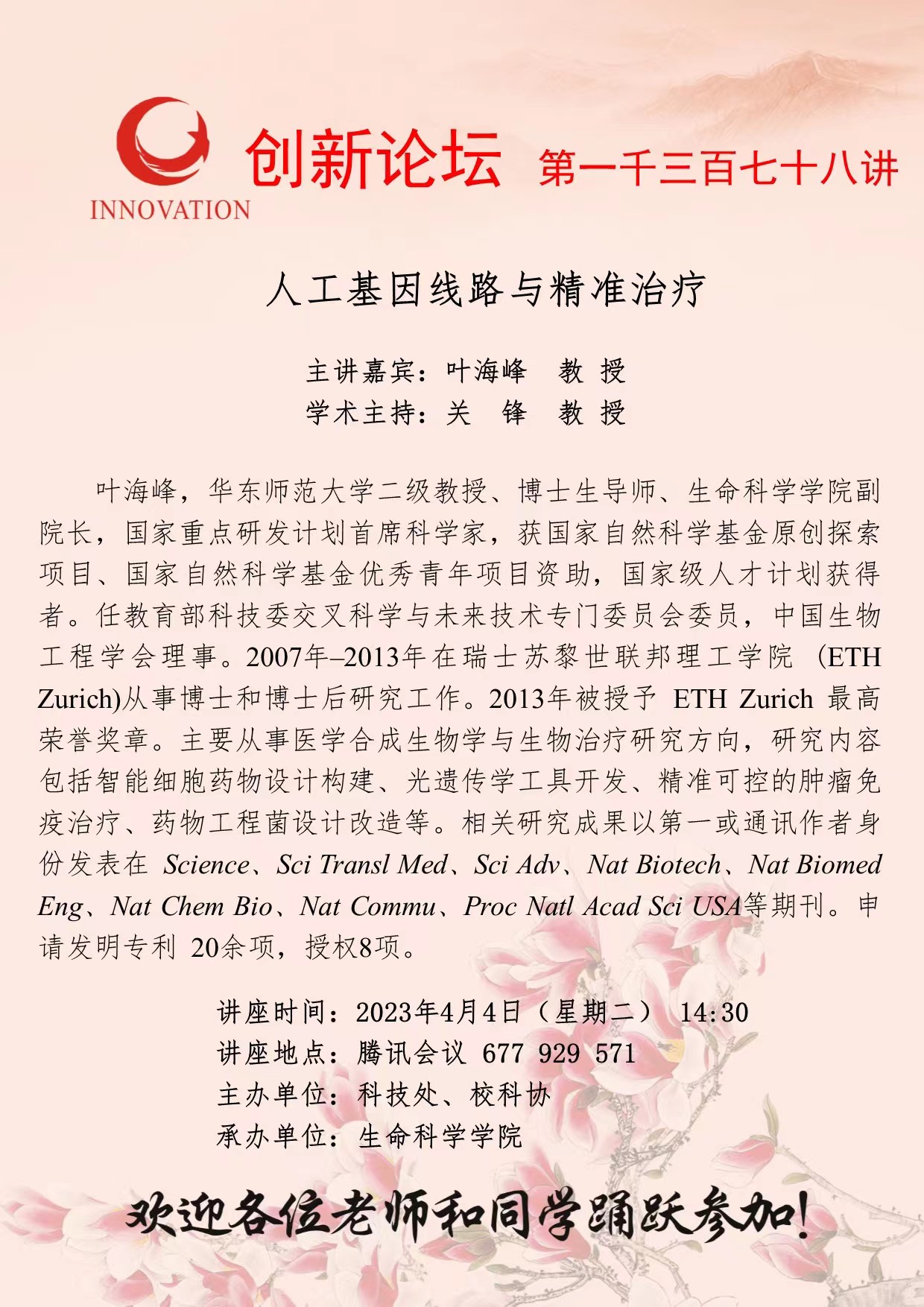 叶海峰 教授 8868体育登录创新论坛第一千三百七十八讲:人工基因线路与精准治疗 讲座时间 2023年4月4日(星期二) 14:30 讲座地点 腾讯会议 677 929 571 讲座人介绍 叶海峰 教授 讲座内容