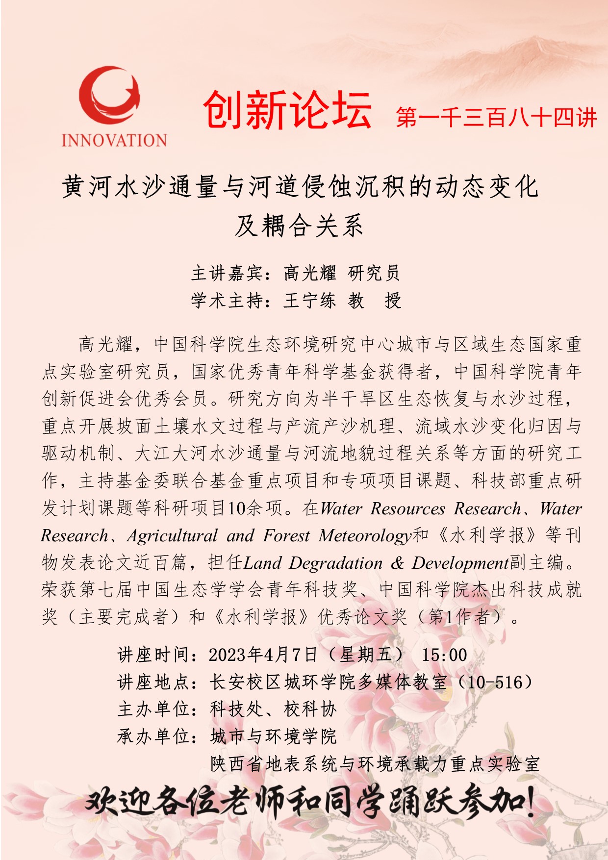 高光耀 研究员 8868体育登录创新论坛第一千三百八十四讲:黄河水沙通量与河道侵蚀沉积的动态变化及耦合关系 讲座时间 2023年4月7日(星期五) 15:00 讲座地点 长安校区城环学院多媒体教室(10-516) 讲座人介绍 高光耀 研究员 讲座内容